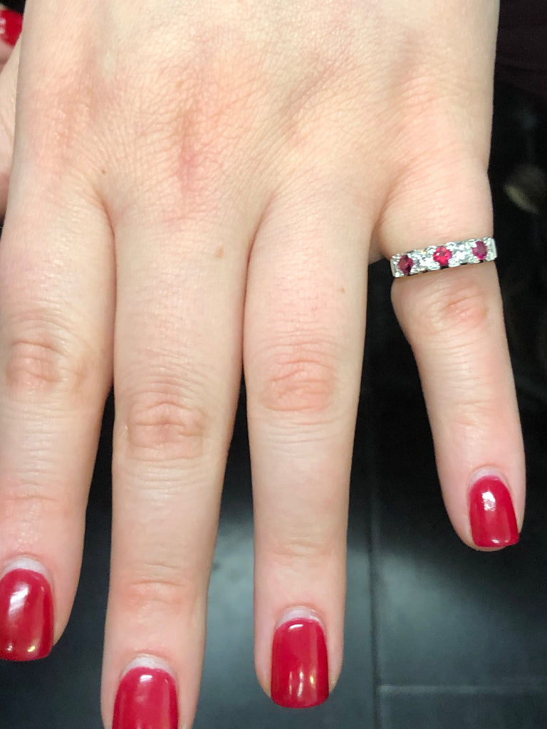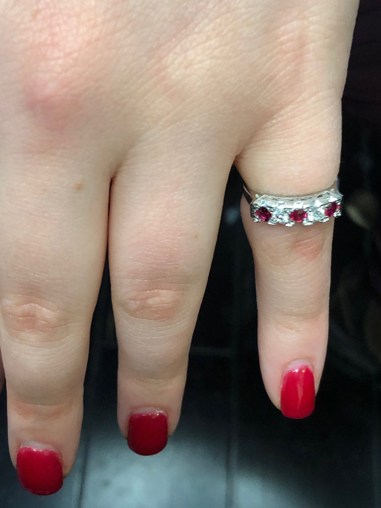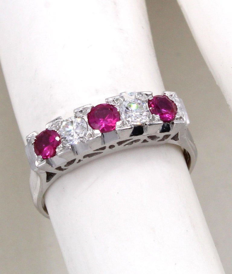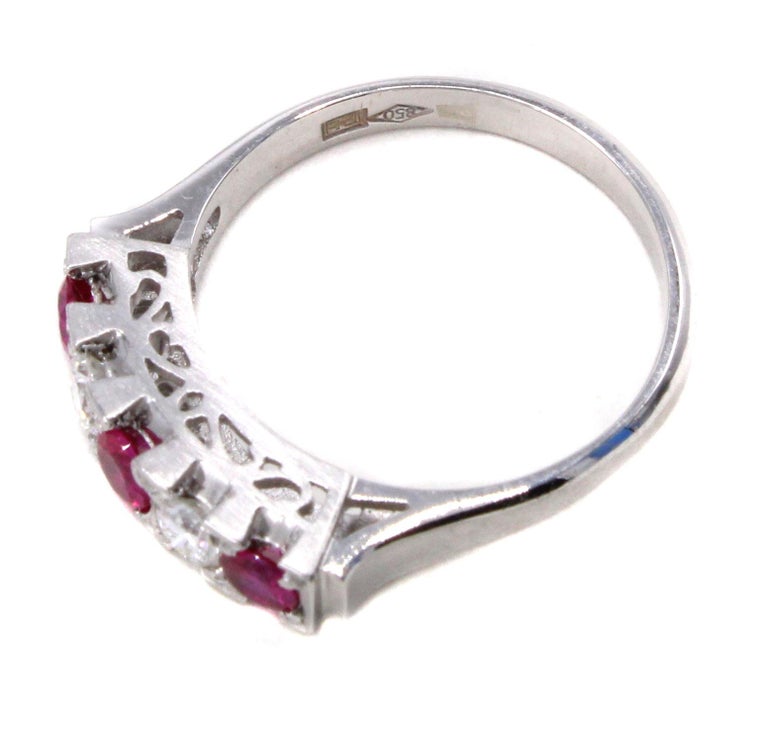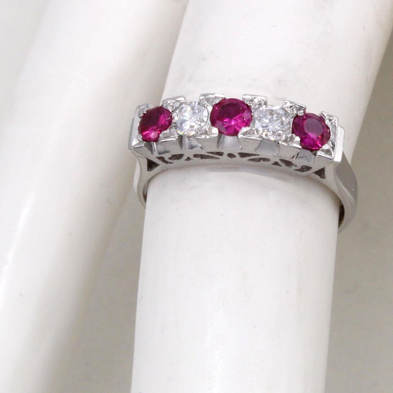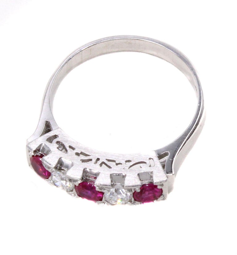 This finely handcrafted platinum 1950s ring features 3 vivid red round rubies spaced by 2 bright white round cut diamonds. An amazing contrast of color, beautifully set on a gallery with decorative a jour work with a mat polish. Item Code D3440