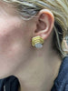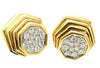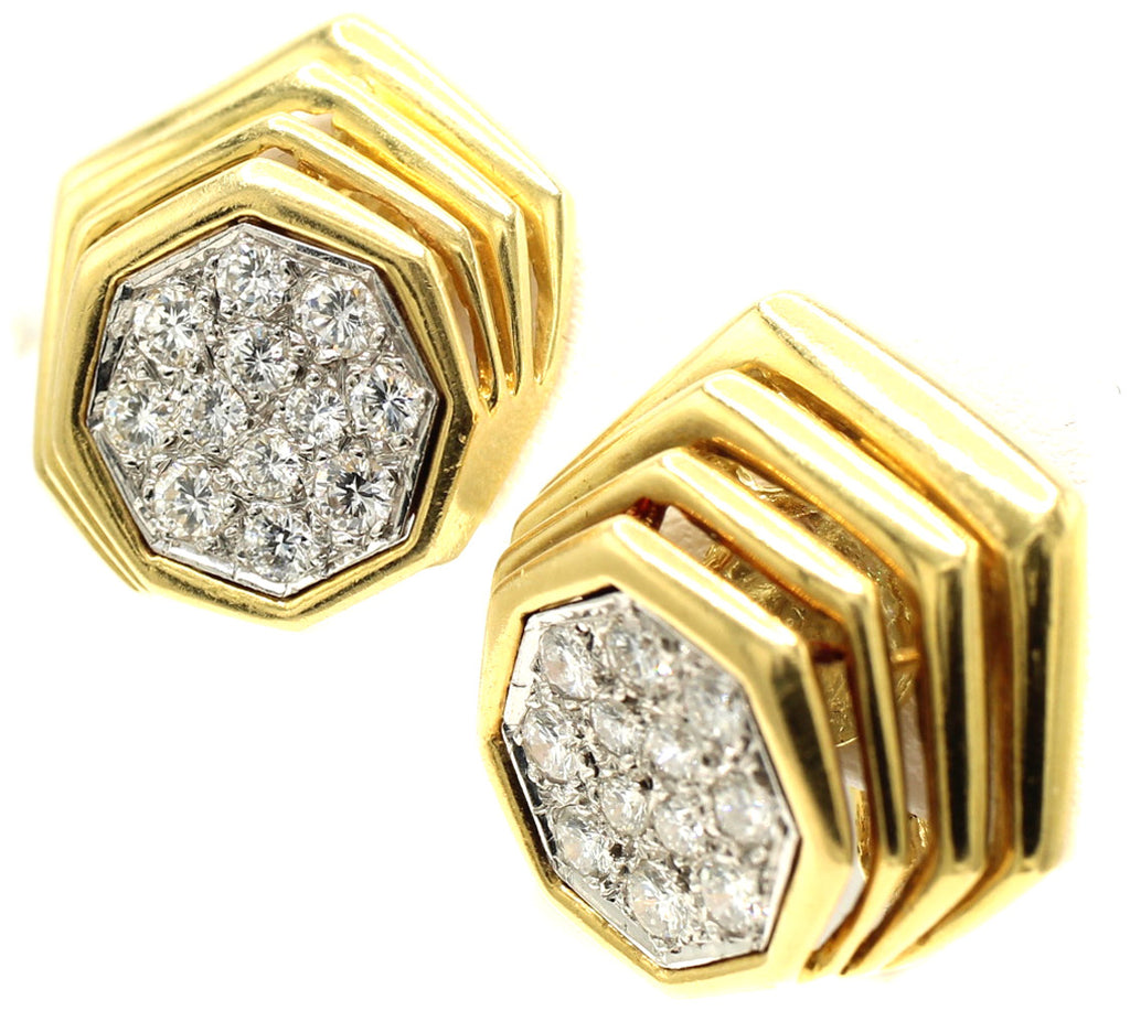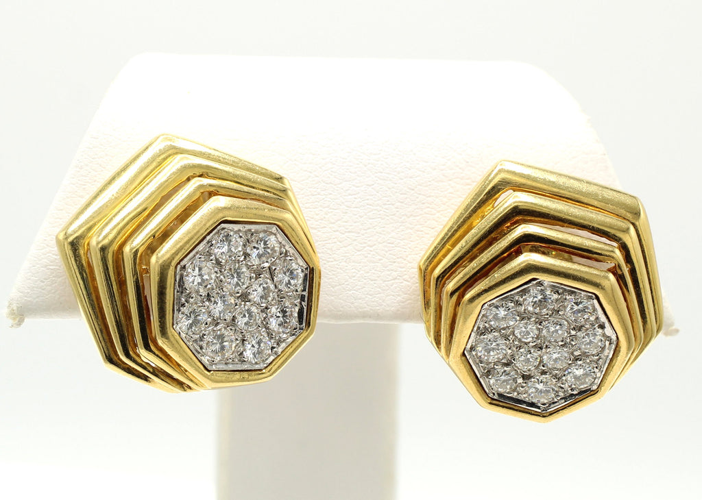 Beautifully designed and masterfully handcrafted, these 1980s diamond 18 karat yellow gold ear clips make for a chic and fun wear for any occasion. The abstract design with polished gold bars descending to the center piece, which is pavé set with beautiful, bright, white, and sparkly round brilliant cut diamonds, gives this earring a stunning appearance on the ear. 12 round brilliants with an approximate total diamond weight of 1.60 carats. Secured by a post and omega clip back. Diameter: 0.75 in (19.05 mm). 18.2 Grams. Stamped 18K