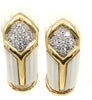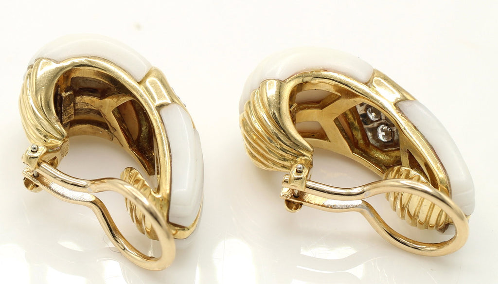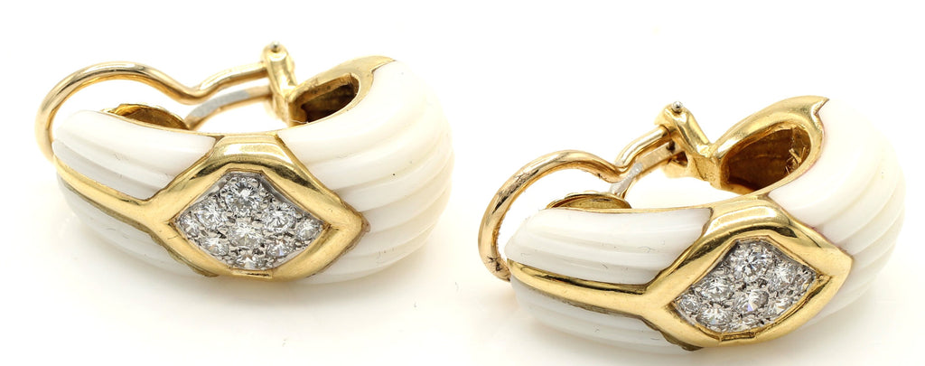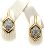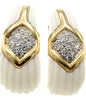 Rive Gauche JewelryBeautifully designed and masterfully handcrafted 1980s ear clips. Carved white coral with an inlay of 18 karat polished yellow gold, centrally set with bright white and sparkly round brilliant cut diamonds. A wonderful, most chic earring for any occasion. 18 round brilliant cut diamonds weighing approximately 0.75 carats. Secured by a wide omega clip, a post can be added if desired. Width: 0.7 in (17.78 mm), Length: 1 in (25.4 mm).