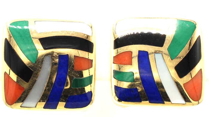 Rive Gauche JewelryBeautifully designed and masterfully handcrafted, these fun and decorative ear clips by Asch Grossbardt are perfect for everyday wear on all occasions. Lapis Lazuli, Jasper, Malachite, Onyx and Mother of Pearl set in borders of 14 karat yellow gold make for a beautiful contrast of colors and a chic wear. Posts and omega clips make for a secure wear on the ear. Width: 0.75 in (19.05 mm)Length: 0.75 in (19.05 mm)