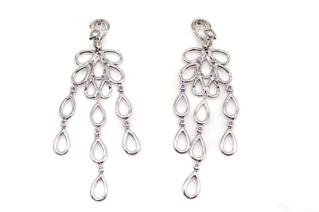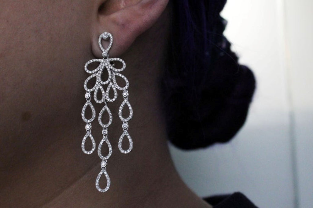 Rive Gauche JewelryGorgeous, beautifully hand-crafted 18-karat white gold dangling earrings set with 248 bright white and sparkly round brilliant cut diamonds. The total diamond weight which is stamped on the back of the lever which connects to the omega clip back is 1.68 carats. The pear-shape design of the open work elements, all encrusted with diamonds, give these dangling earring its chic and sexy look. The flexible top, which is connected to a cluster of 7 elements, has 3 rows of flexibly connected pear-shaped elements connected to it, giving this earring a wonderful, lively appearance with every movement of the head. Created in a perfect weight for a comfortable and constant wear, these ear-pendants can be worn for lengthy periods of times and for all occasions. They extend 2.75 inches from the earlobe.
