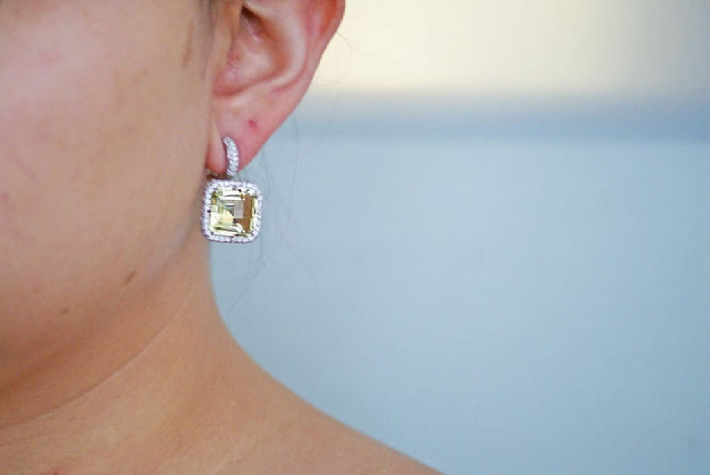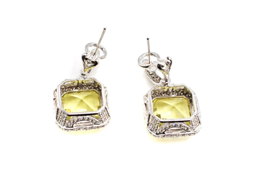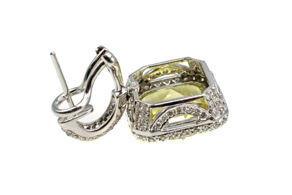 These vivid lemon citrines are perfectly matched in cut and color, measured to weigh approximately 8.5 carats each, with a total approximate weight of 17 carats.The beautiful mixed step-cut give these gemstones incredible life and fire. While the bottoms of these stones have been cut with the traditional emerald-cut faceting, the tops are faceted with over 40 mainly square shaped facets. Incredibly well hand-crafted the 18 karat white gold mountings are set with 226 bright white and sparkly round brilliant cut diamonds. Having just the right weight these wonderful earrings make for a most comfortable wear. A chic and fun piece of jewelry, wearable for any occasion.