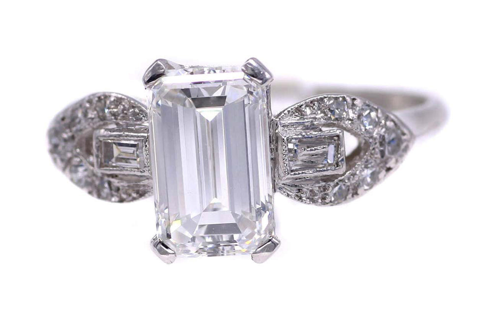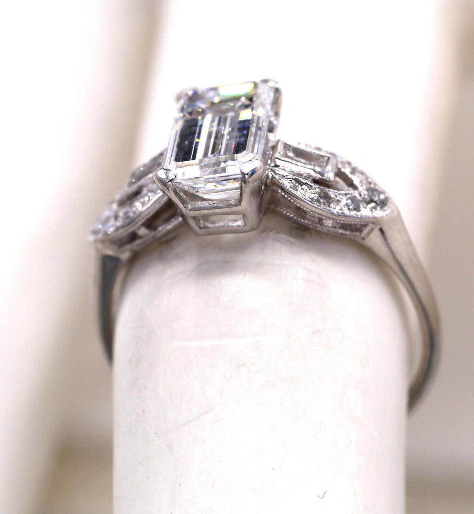 Rive Gauche JewelryA beautifully cut and shaped 1.58 carat emerald cut diamond accompanied by a report from the GIA is the center piece of this lovely platinum diamond engagement ring. The color has been graded as F and the clarity as VS1. The shanks are embellished by a tear-drop motif chanel-set with bright white round diamonds and a baguette cut diamond in its center.