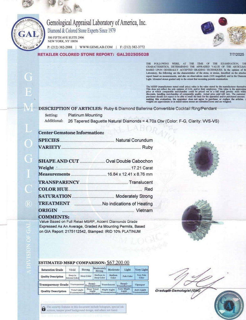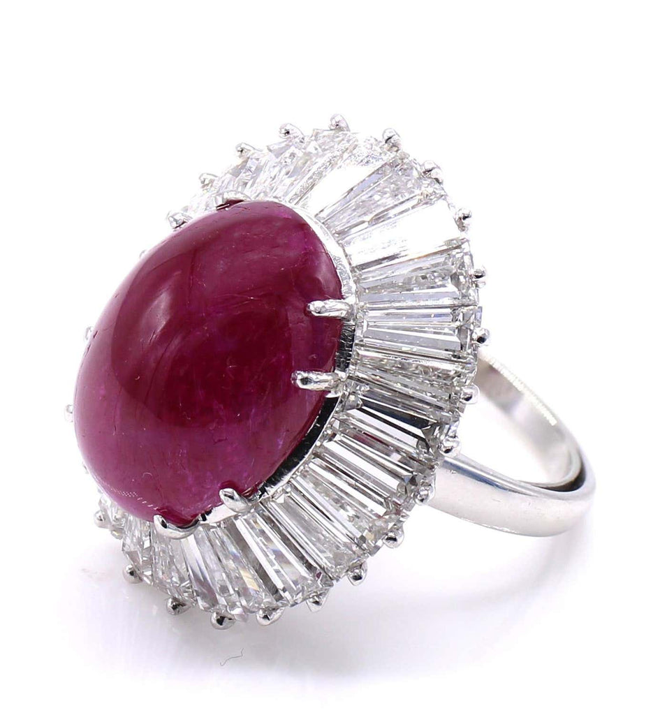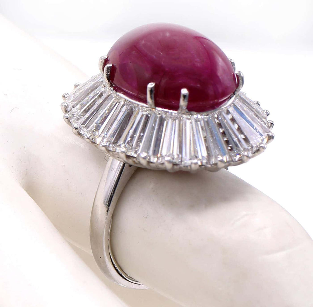 Rive Gauche JewelryThe centerpiece of this 1960s impressive ballerina ring is a cabochon ruby weighing 17.21 carats. The ruby is accompanied by a report from the GIA stating that the origin is Vietnam and that it is natural with no heat treatment. Embellishing the ruby are 26 long bright white and sparkly tapered baguettes weighing approximately 4.70 carats. All set in a handcrafted platinum mounting with a ring size of 6.75 which can be sized. This gorgeous ring also comes with an appraisal form the Gemological Appraisal Laboratory of America with a value of $ 67,200. We are offering this ring well below this appraise value. Item Number: 14209-1