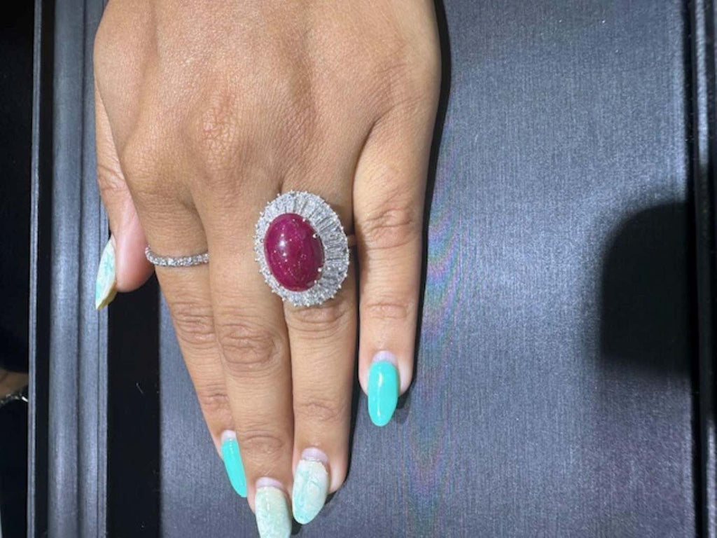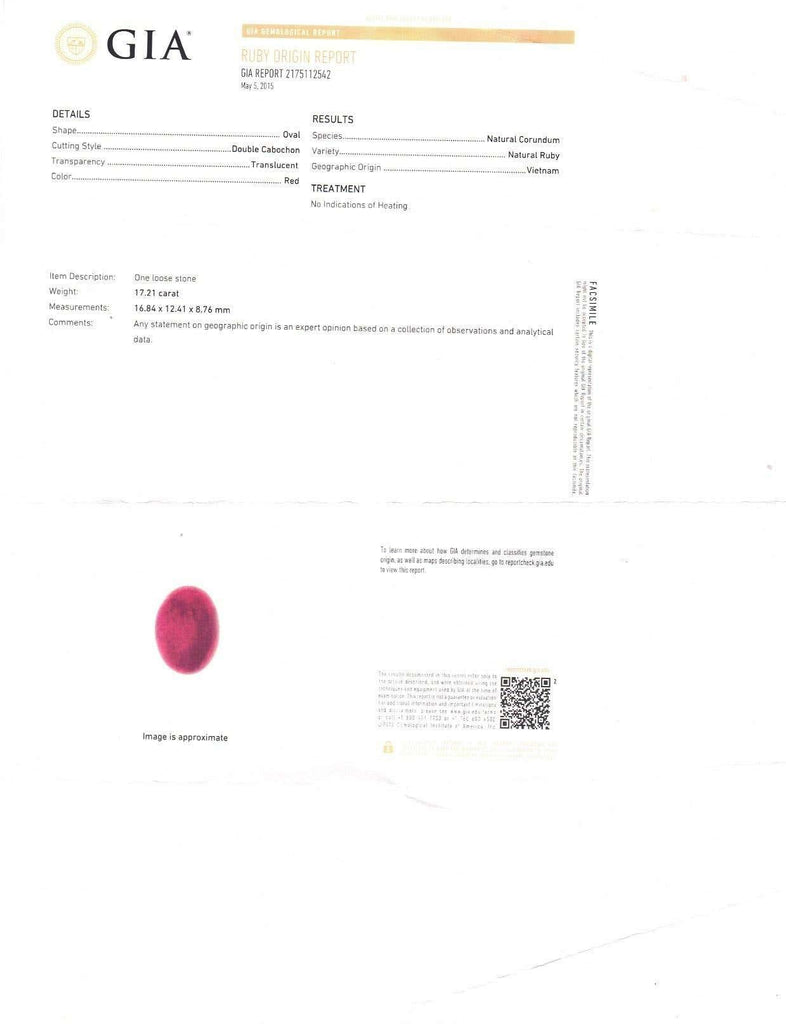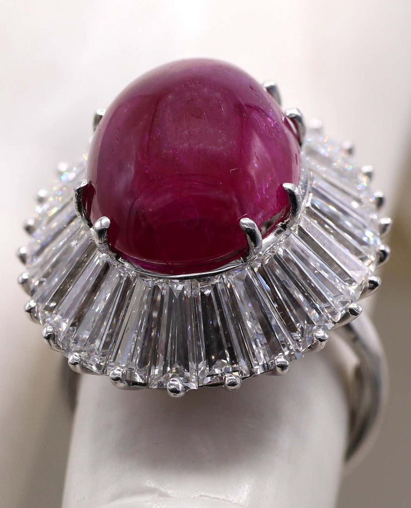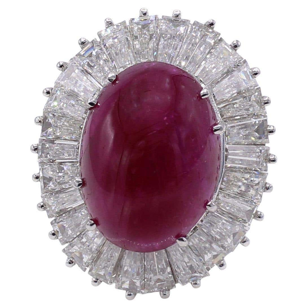 Rive Gauche JewelryThe centerpiece of this 1960s impressive ballerina ring is a cabochon ruby weighing 17.21 carats. The ruby is accompanied by a report from the GIA stating that the origin is Vietnam and that it is natural with no heat treatment. Embellishing the ruby are 26 long bright white and sparkly tapered baguettes weighing approximately 4.70 carats. All set in a handcrafted platinum mounting with a ring size of 6.75 which can be sized. This gorgeous ring also comes with an appraisal form the Gemological Appraisal Laboratory of America with a value of $ 67,200. We are offering this ring well below this appraise value. Item Number: 14209-1