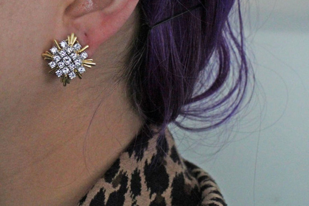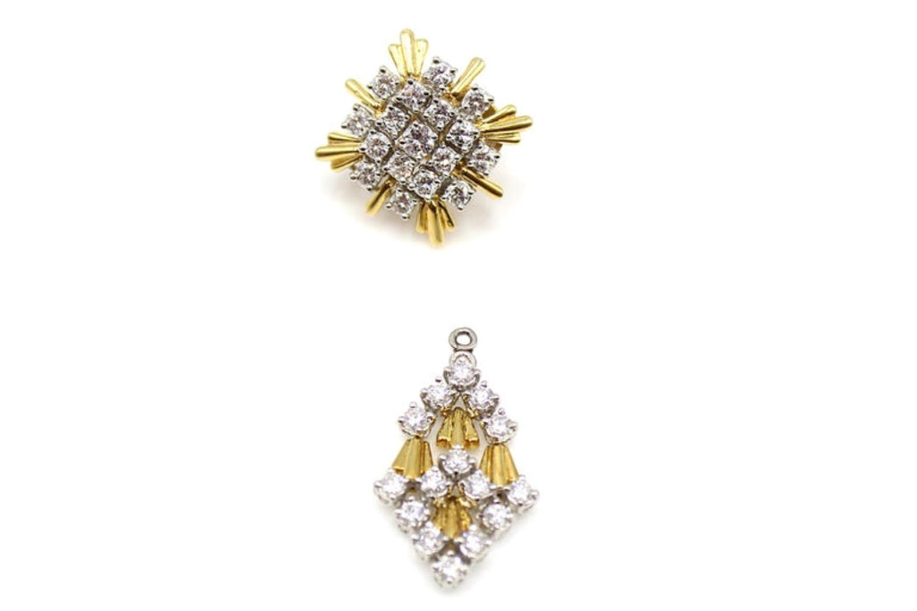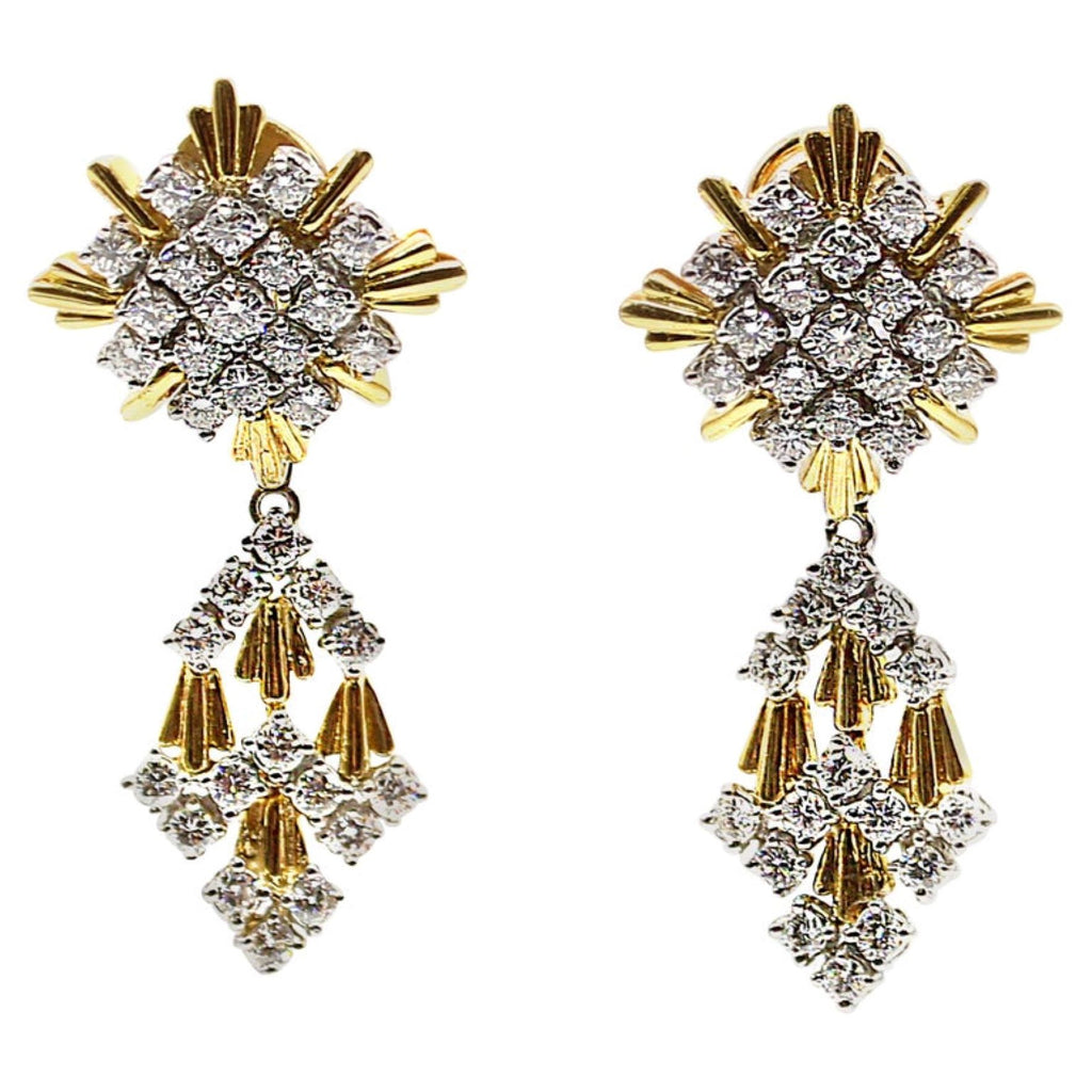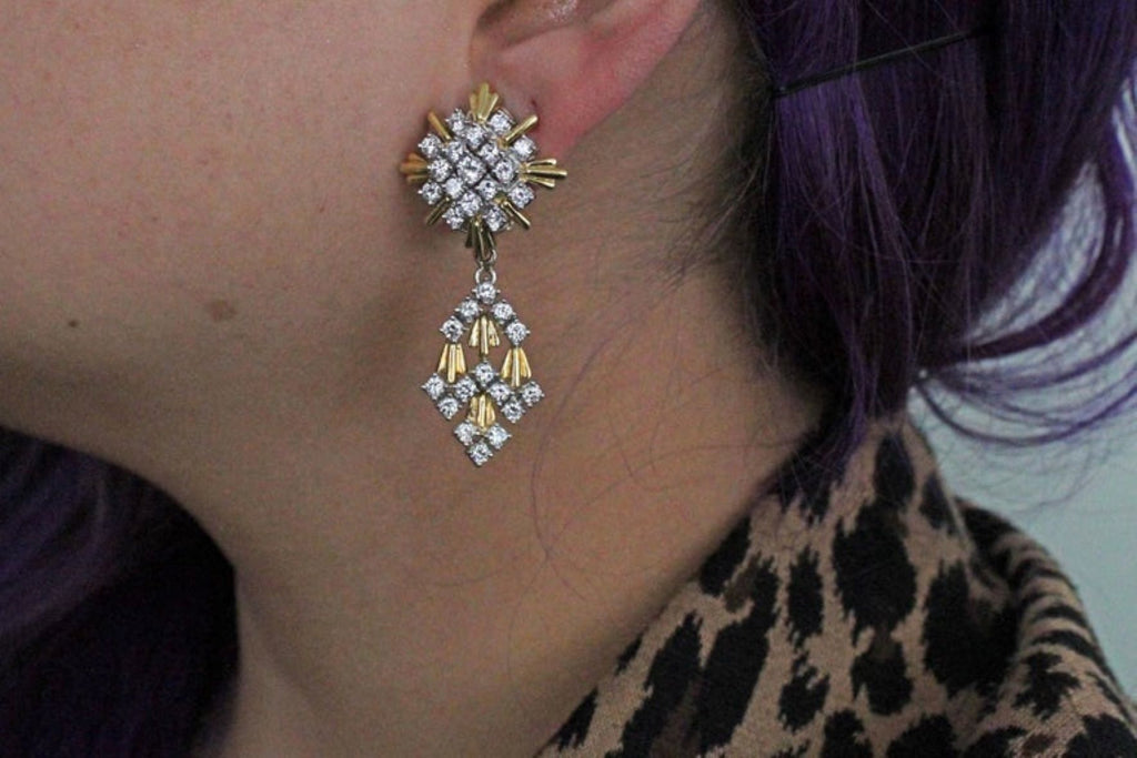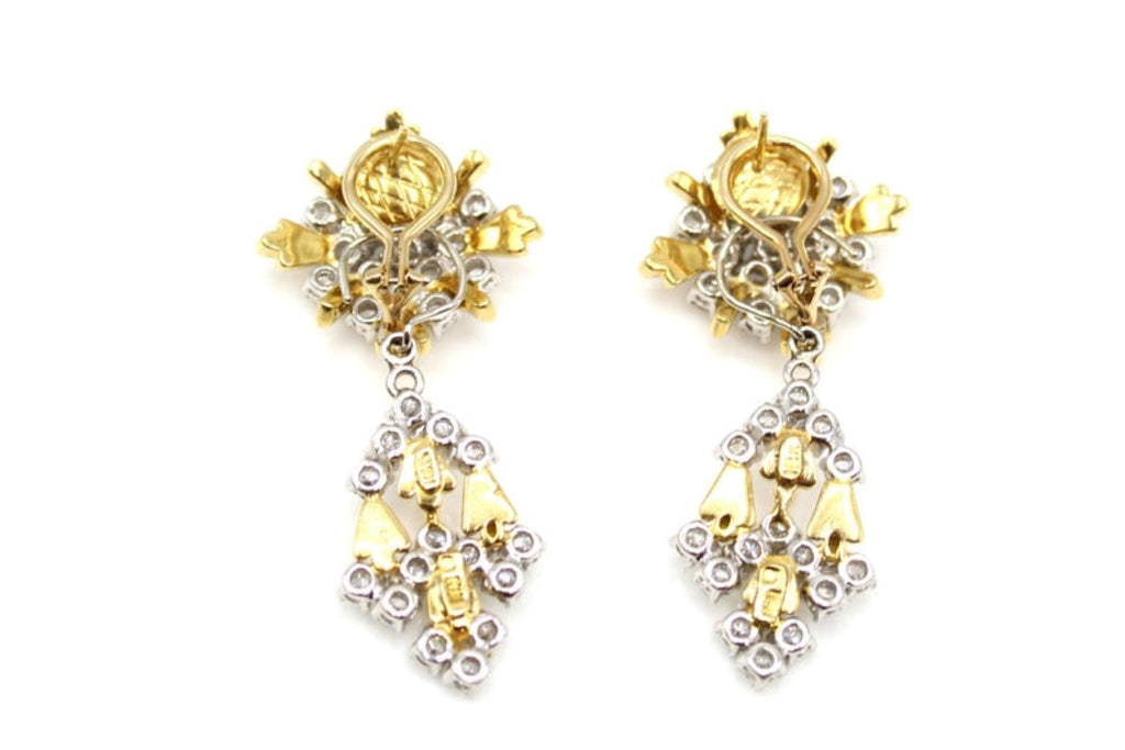 Rive Gauche JewelryMasterfully hand-crafted in 18-karat white and yellow gold, these gorgeous 1980s stylish earrings can be worn as stunning evening ear pendants or with the flexible bottom element detachable as a chic pair of daytime ear clips. The tops are designed as starbursts with a center of perfectly matched bright white and sparkly round brilliant cut diamonds set in white gold, with curved bars of high polished yellow gold extending on the periphery, giving this piece of jewelry a magnificent contrast and three-dimensional look. The detachable and flexible bottom element has the appearance of flowing drapes with the same wonderful bright diamonds and detailed gold work. The back of the earring is stamped with the exact weight of the diamonds with a total weight of 9.20 carats. The average color of the diamonds is E-F with a clarity of VVS-VS. A delightful piece of jewelry wearable for multiple occasions and comfortable wear, having been worked not to be heavy but still showing their unique workmanship.