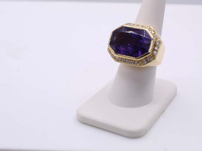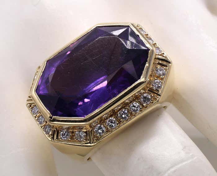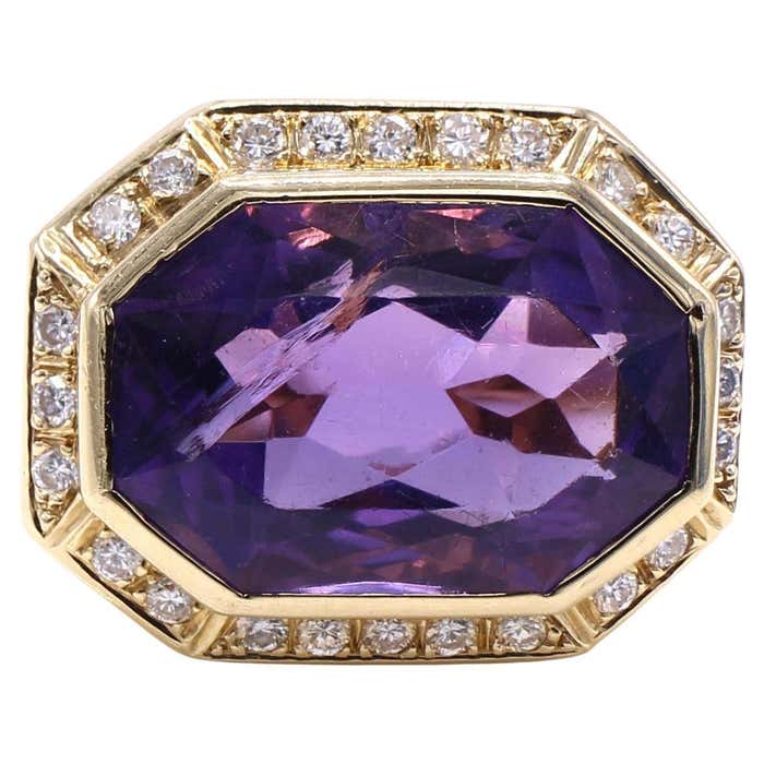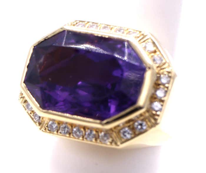 Rive Gauche JewelryBold 1980s amethyst diamond 14 K yellow gold ring. The beautifully cut octagonal step-cut amethyst weighing approximately 16 carats has a rich, velvety purple color with deep saturation. The center gem is bezel set in a wonderfully handcrafted yellow gold mounting surrounded by 24 bright white brilliant cut diamonds with an approximate total weight of 1 carat. Ring size 7.5, can be sized.