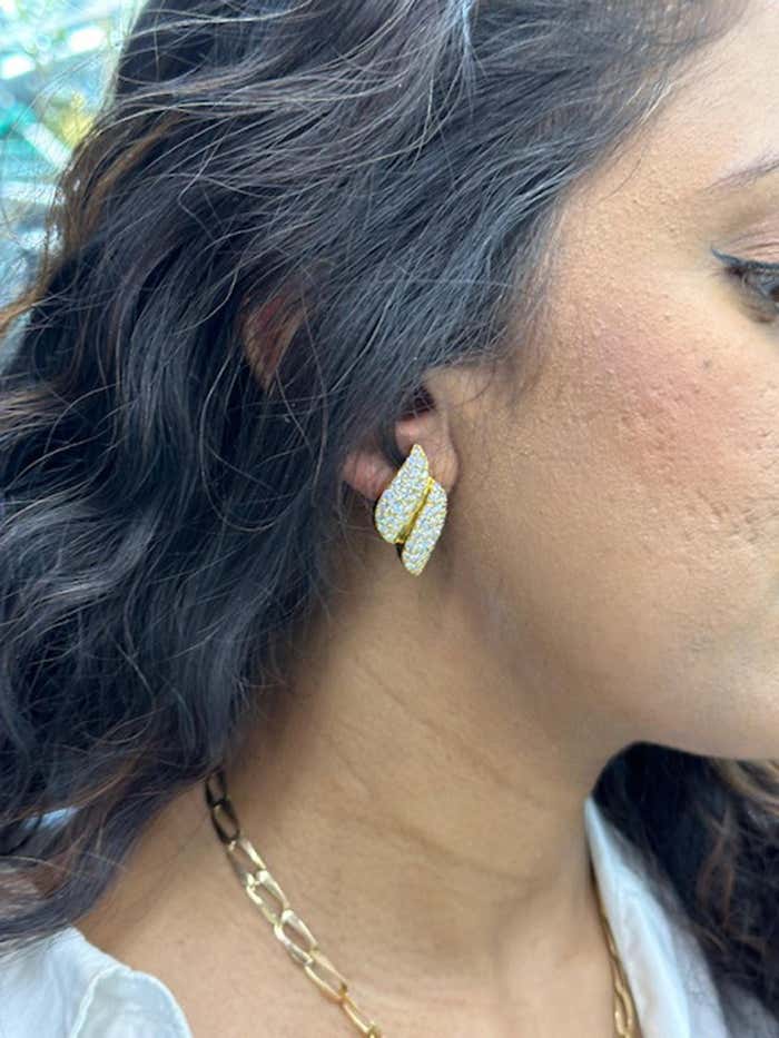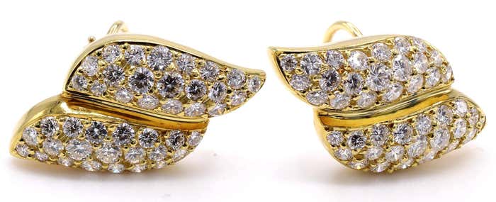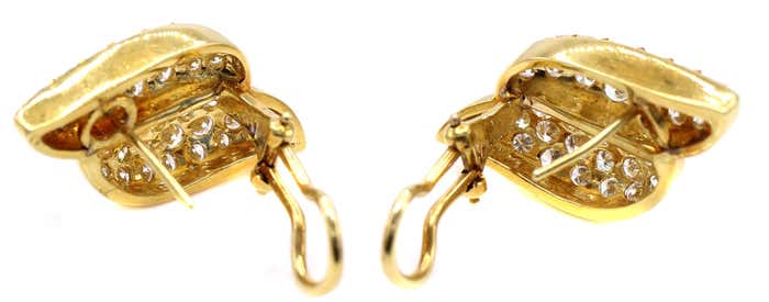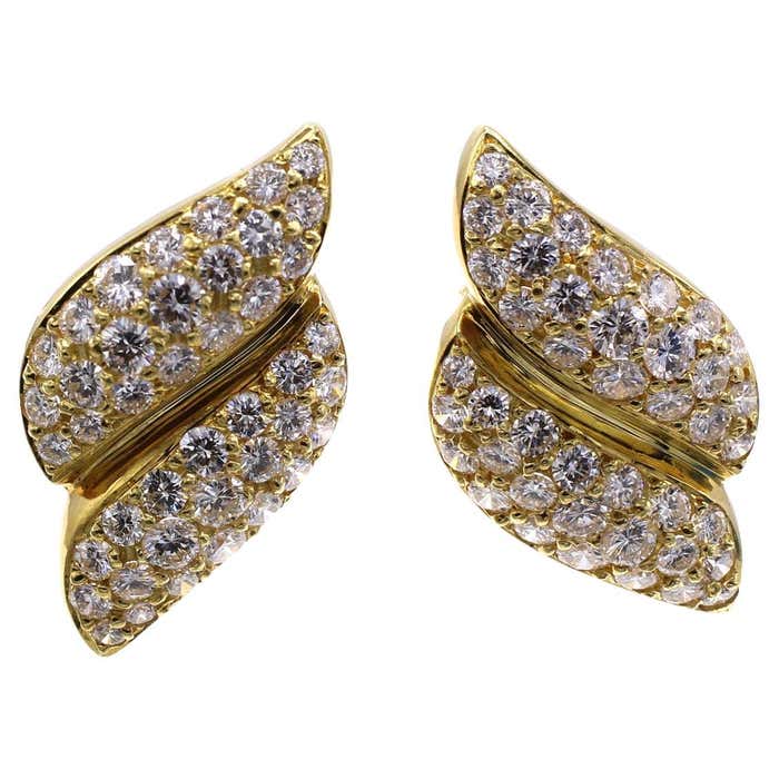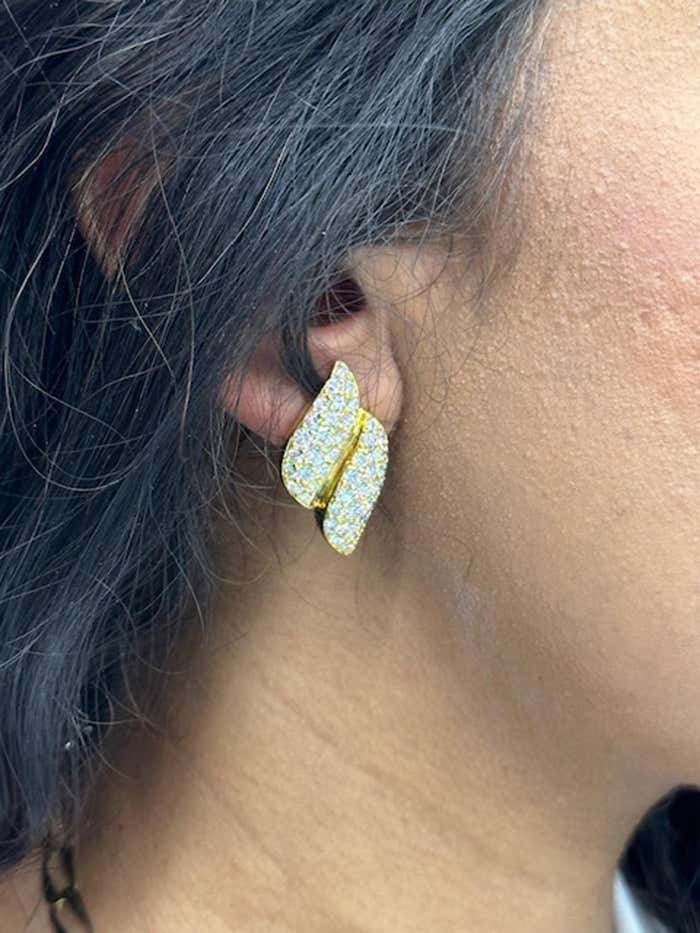 Rive Gauche JewelryBeautifully designed and masterfully handcrafted in 18-karat yellow gold, these 1980s ear clips are chic and stunning on the ear. Set with 84 perfectly matched bright white and lively round brilliant cut diamonds with an approximate total weight of 6 carats. The average color and clarity have been graded as F-G VS. Secured by a post and an omega clip back. Width: 0.65 in (16.51 mm)Length: 1.125 in (28.58 mm)