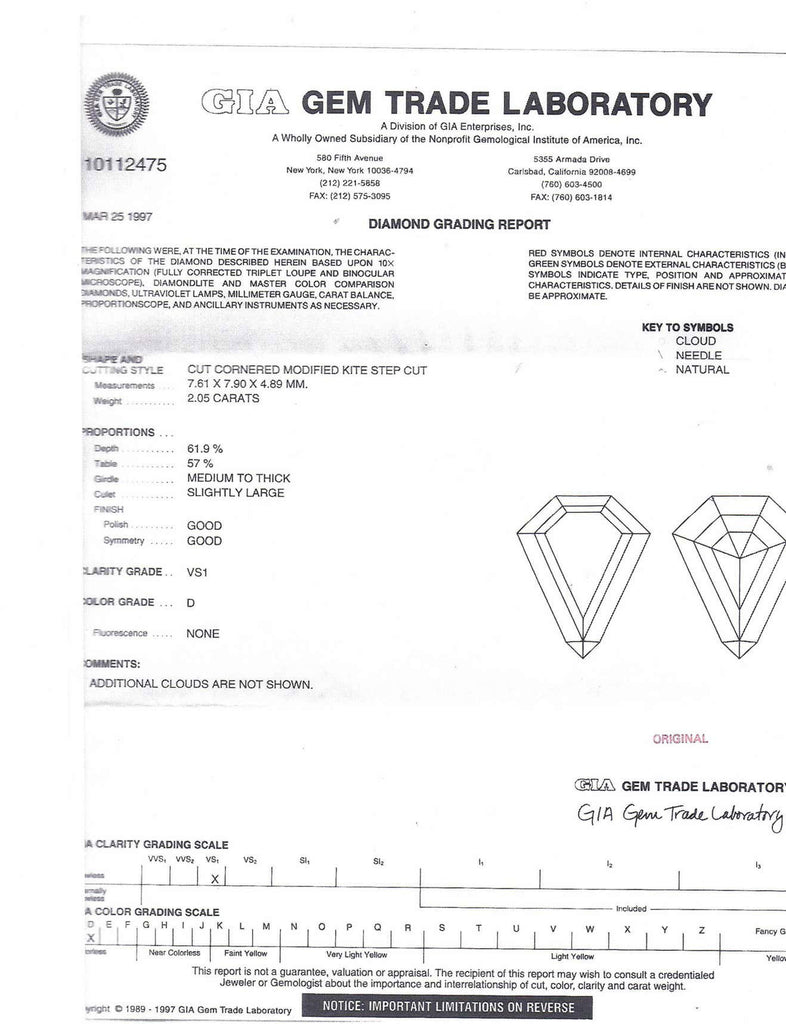 2.05 Carat D VS1 GIA Certified Kite Shape Diamond Platinum Engagement Ring