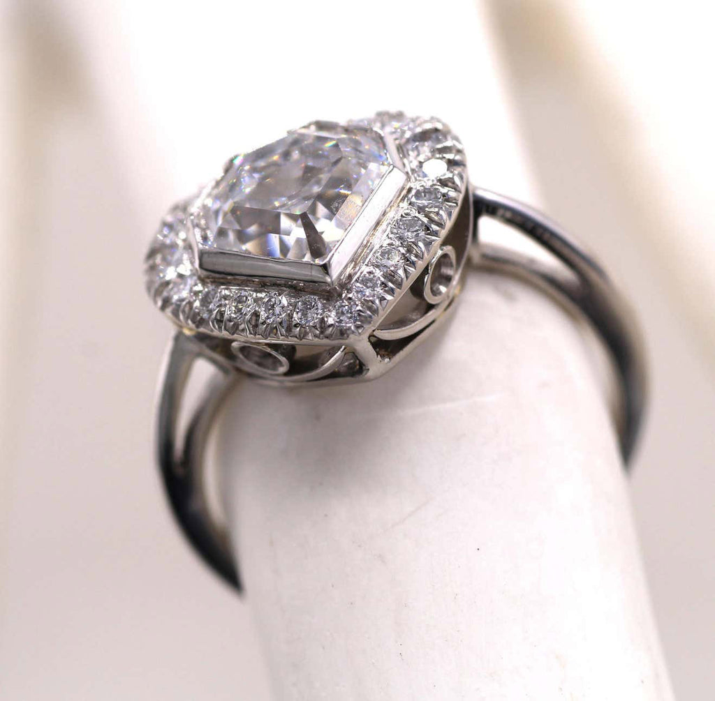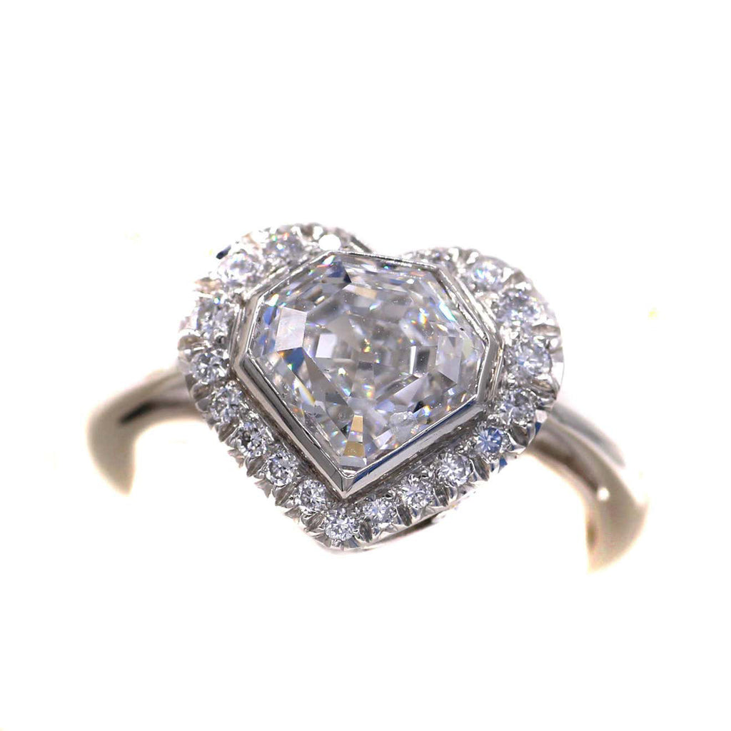 Rive Gauche JewelryThis unique beautifully cut Kite Shape diamond accompanied by a report from the GIA with the highest color grade of D and a clarity of VS1 exhibits an amazing brilliance and fire. Set and a wonderfully designed and exceptionally well handcrafted platinum mounting, the central diamond is set in a bezel which is surrounded by perfectly matched bright white and lively brilliant cut diamonds in a heart-shape design. It is truly a one-of-a-kind engagement ring for someone looking for a special ring.