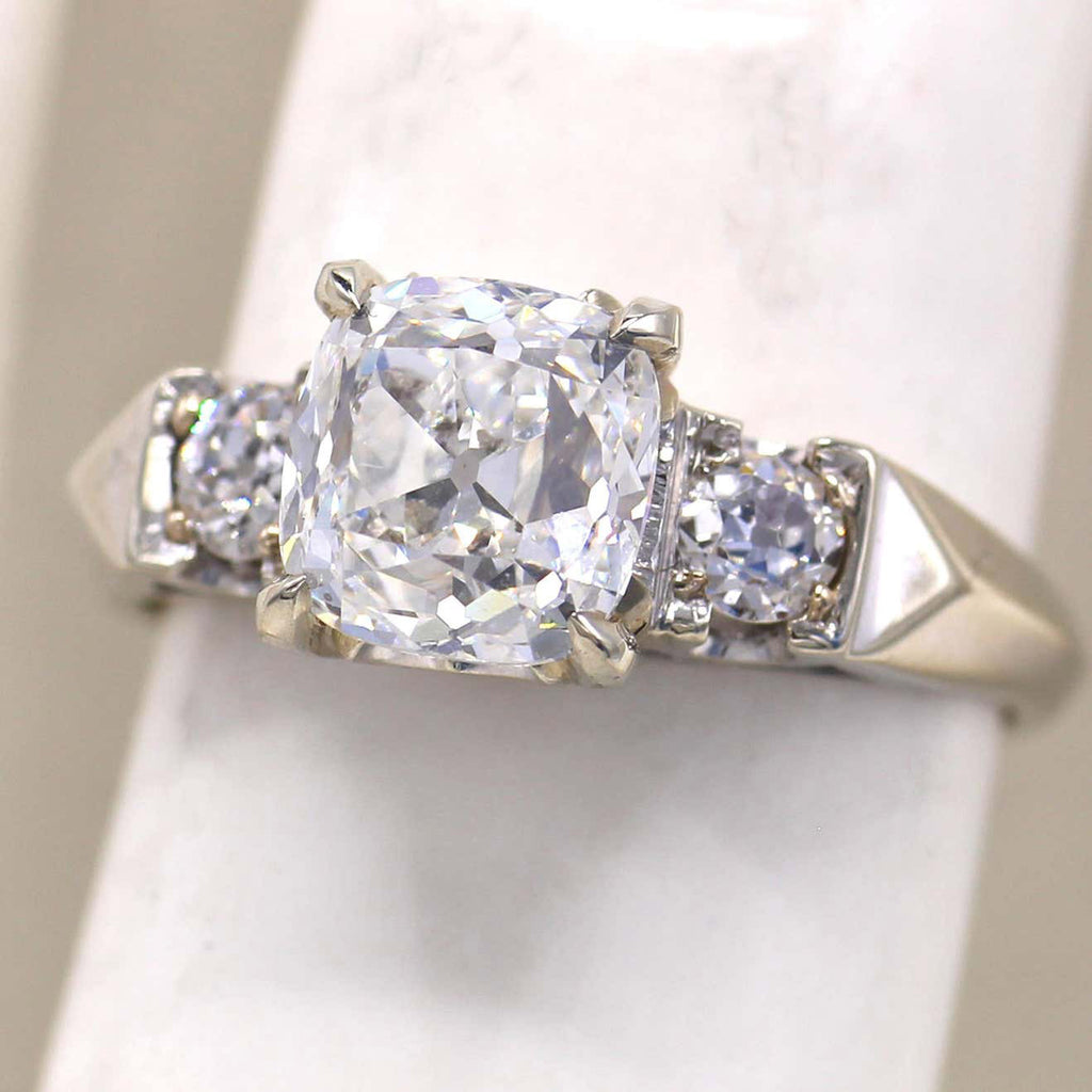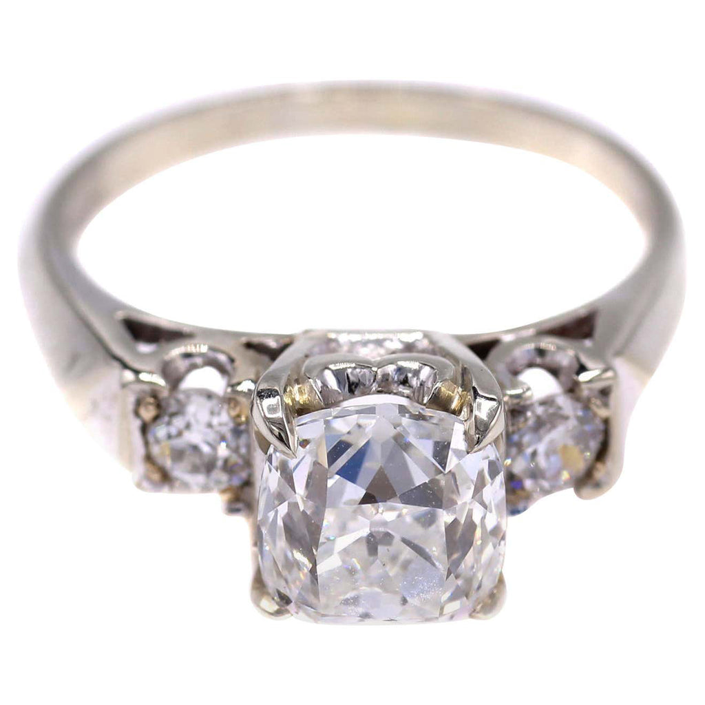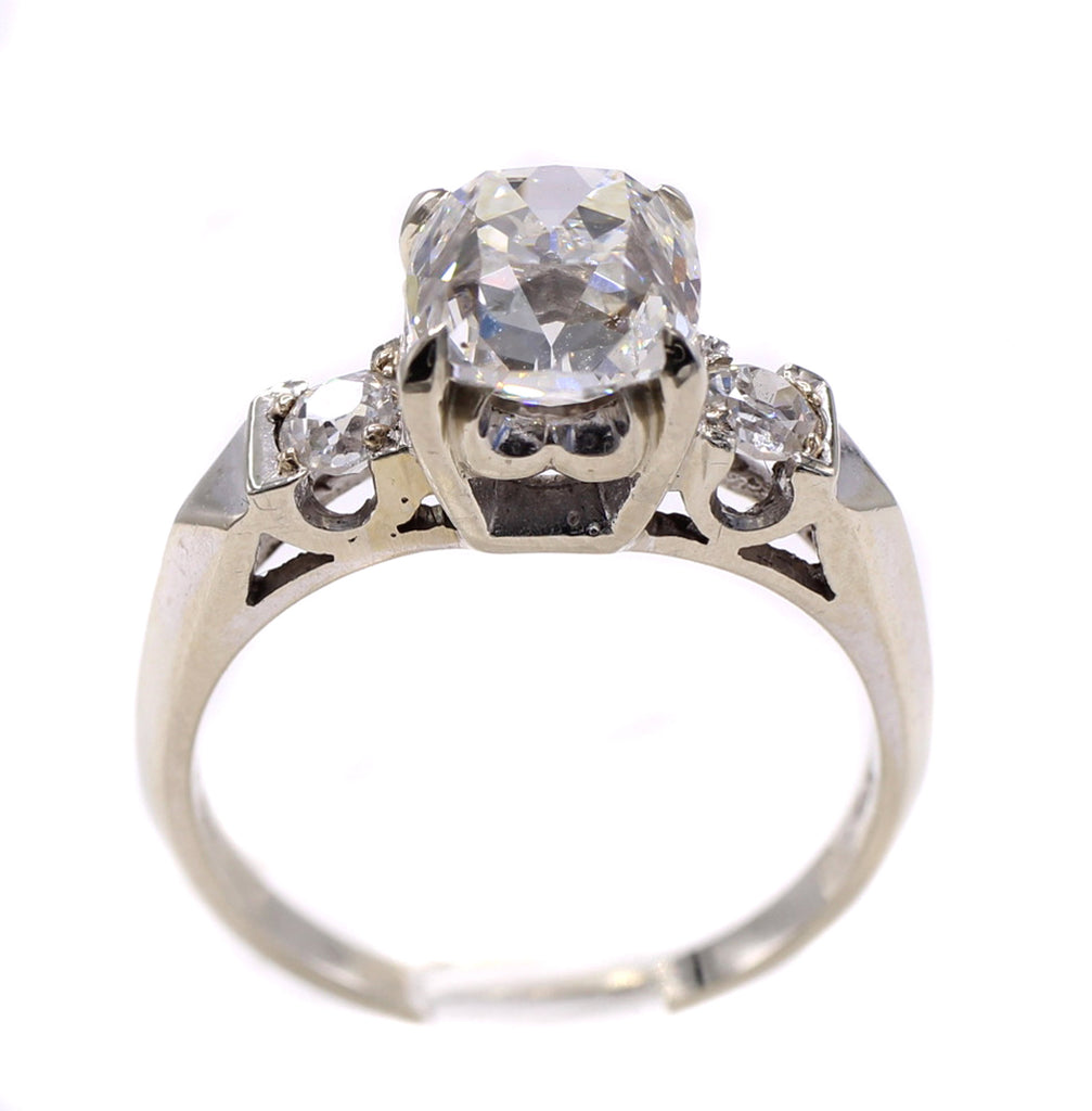 Rive Gauche JewelryGorgeous antique 2.15 carat Old Mine Brilliant accompanied by a report from the GIA with a color grade of G and a clarity of SI1. The SI1 is absolutely not eye visible as the main inclusion is a white feather on the side of the diamond. The lively and extremely brilliant Old Mine Brilliant is set in a contemporary white gold mounting with 2 bright white round diamonds on the sides.