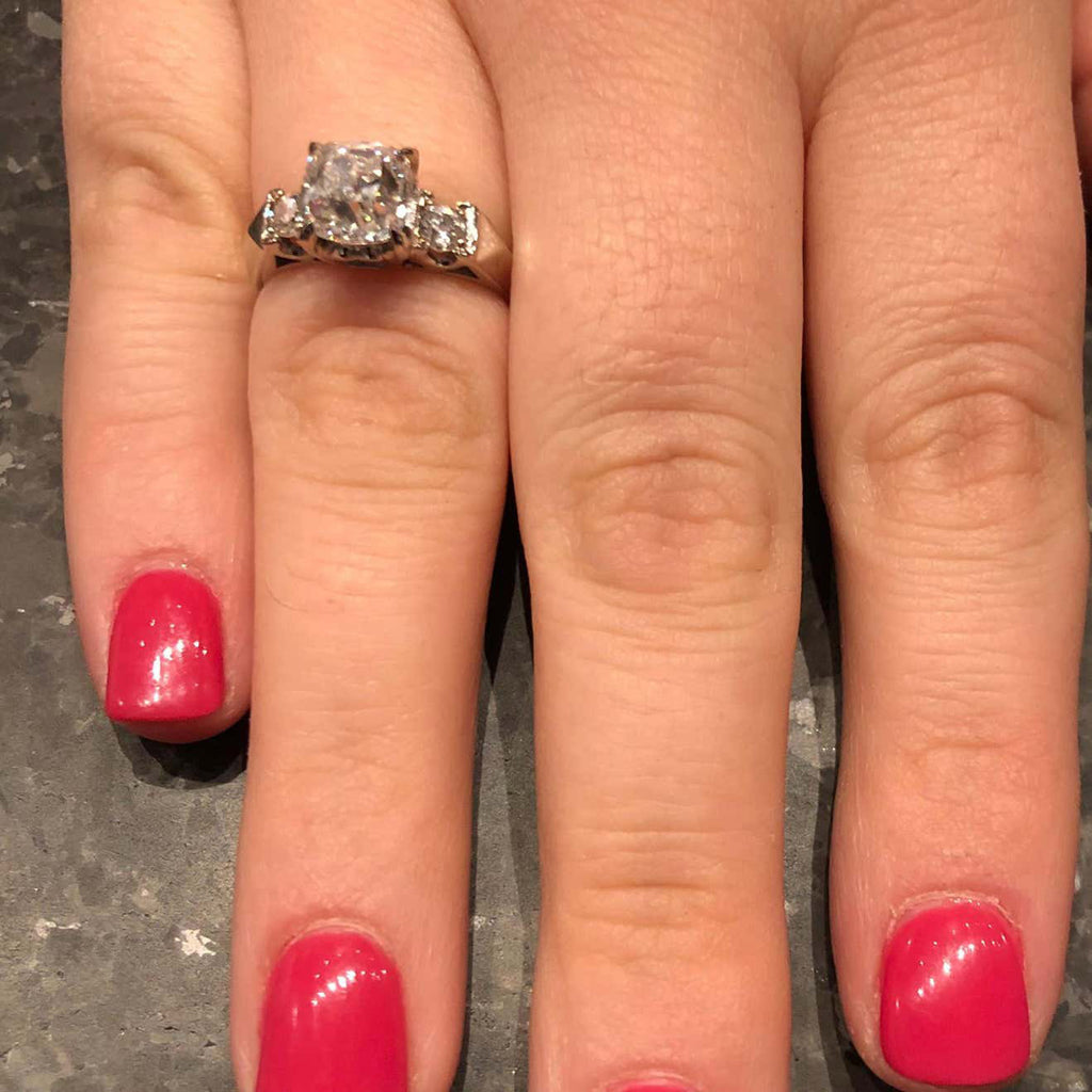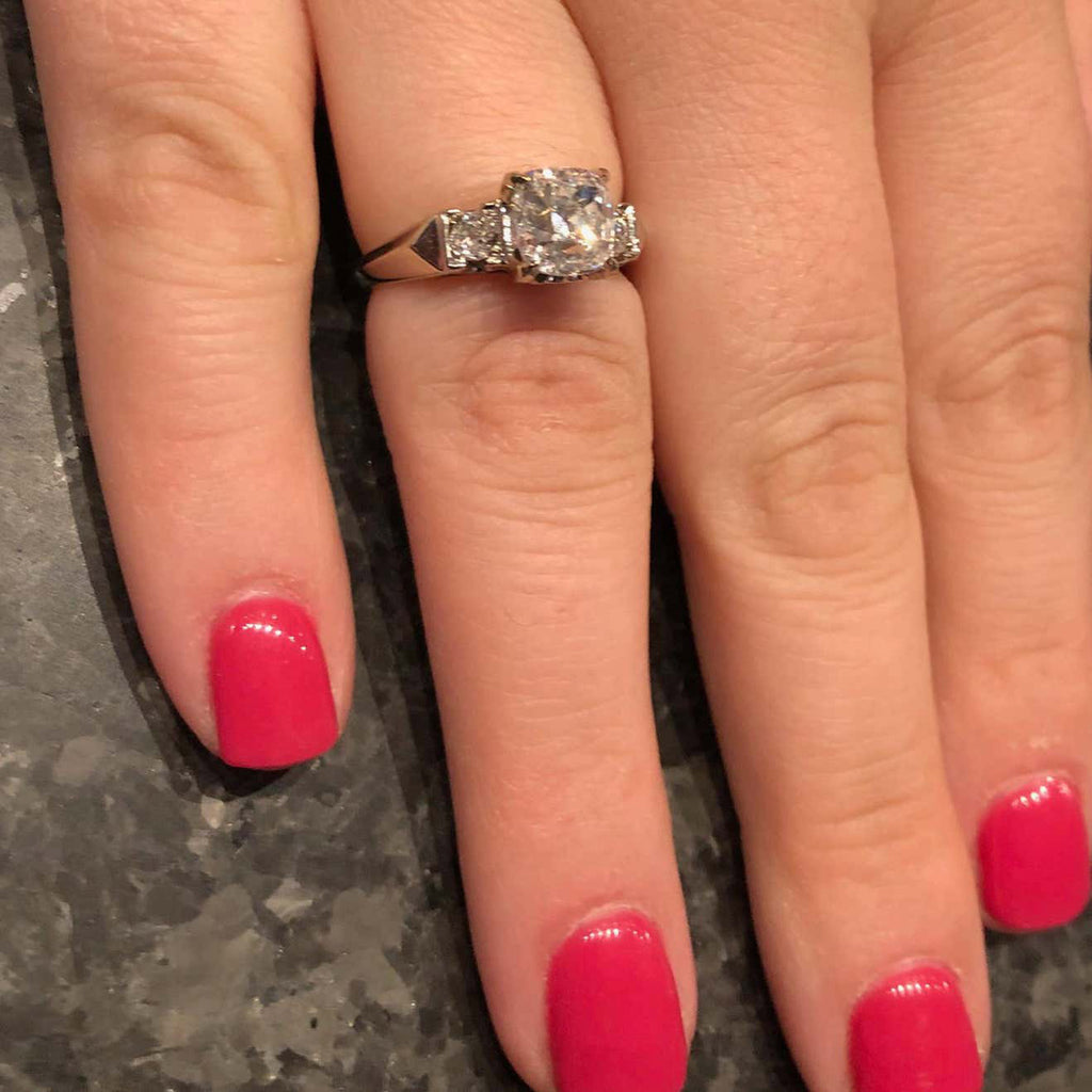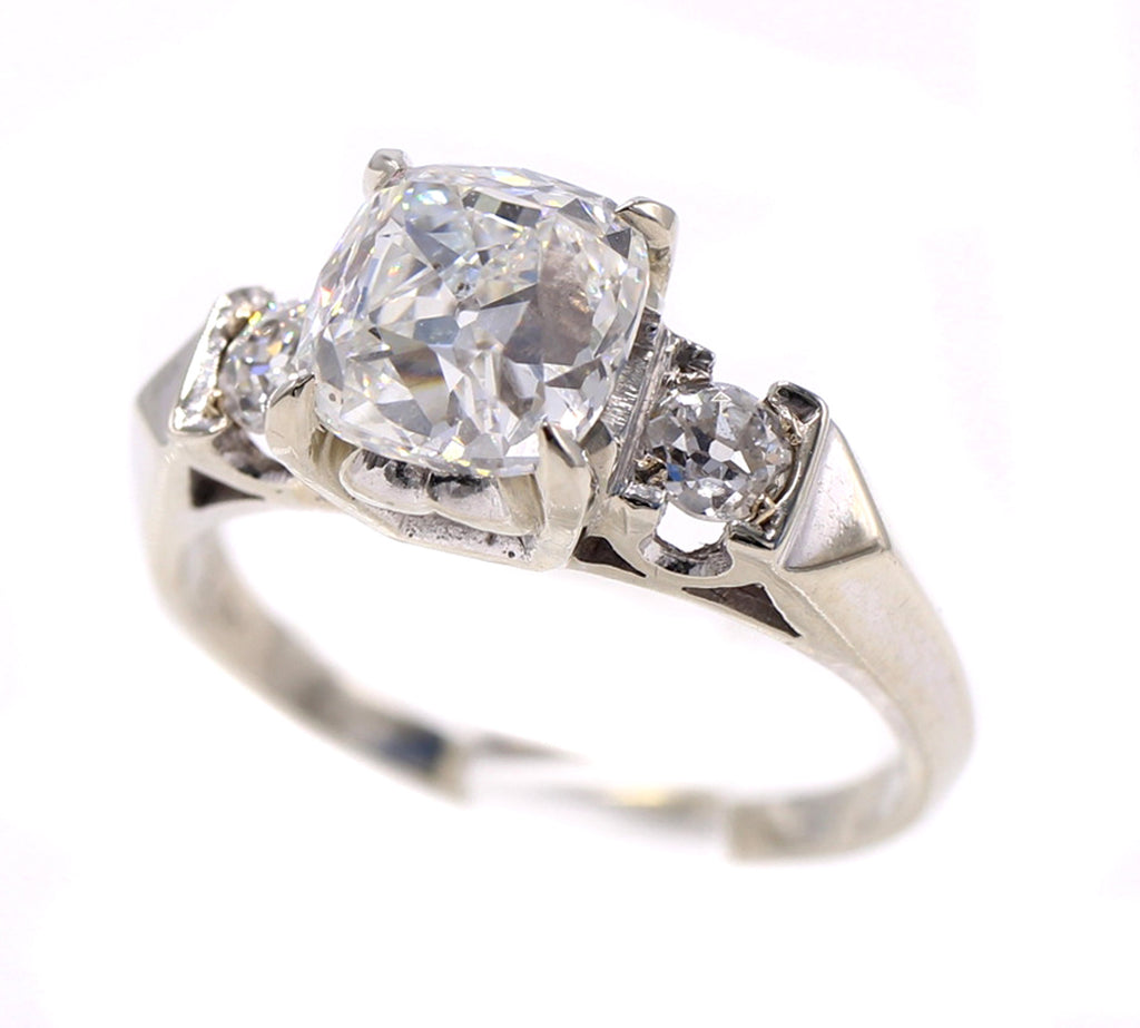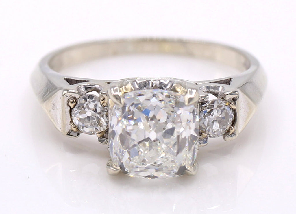 Rive Gauche JewelryGorgeous antique 2.15 carat Old Mine Brilliant accompanied by a report from the GIA with a color grade of G and a clarity of SI1. The SI1 is absolutely not eye visible as the main inclusion is a white feather on the side of the diamond. The lively and extremely brilliant Old Mine Brilliant is set in a contemporary white gold mounting with 2 bright white round diamonds on the sides.