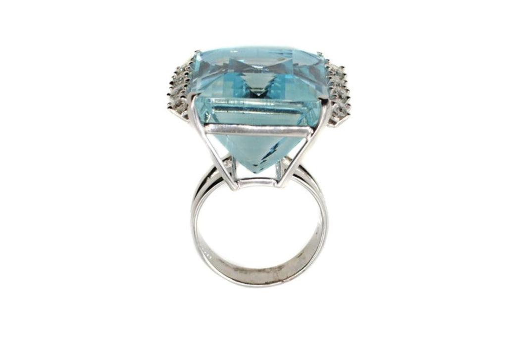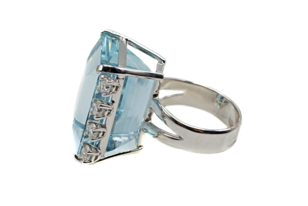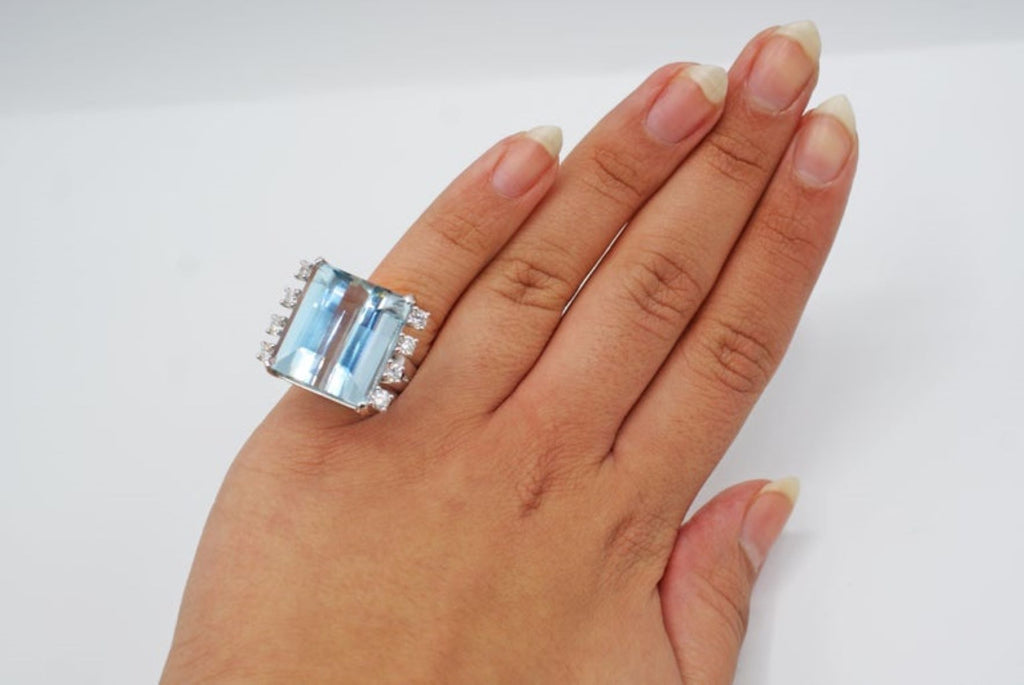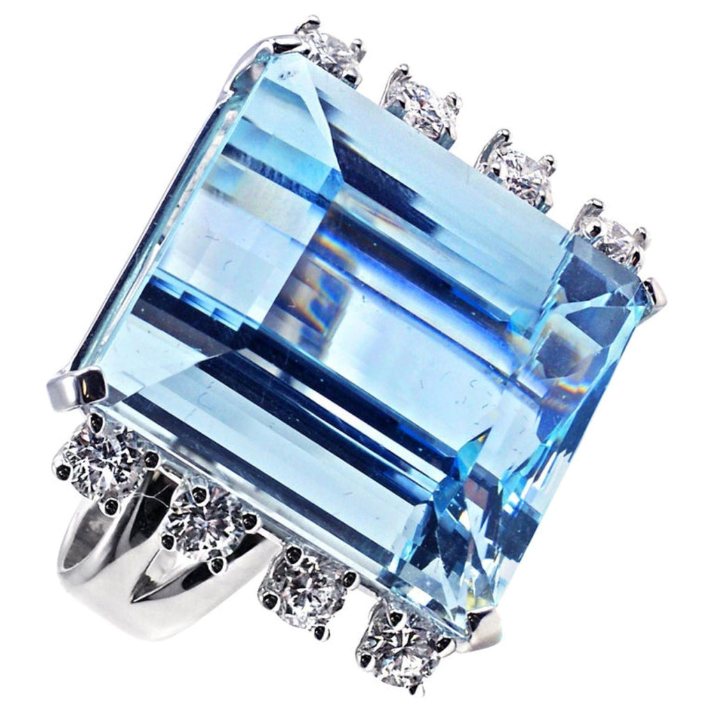 Rive Gauche JewelryThis bold ring shows off a perfectly square step-cut Aquamarine measured to weigh approximately 35 carats. The lively pastel-blue center gem is set with 4 prongs and is embellished by 4 bright white and sparkly brilliant cut diamonds on either side. The total diamond weight is approximately 1 carat.. The ring size is now 6.75 and can be sized.