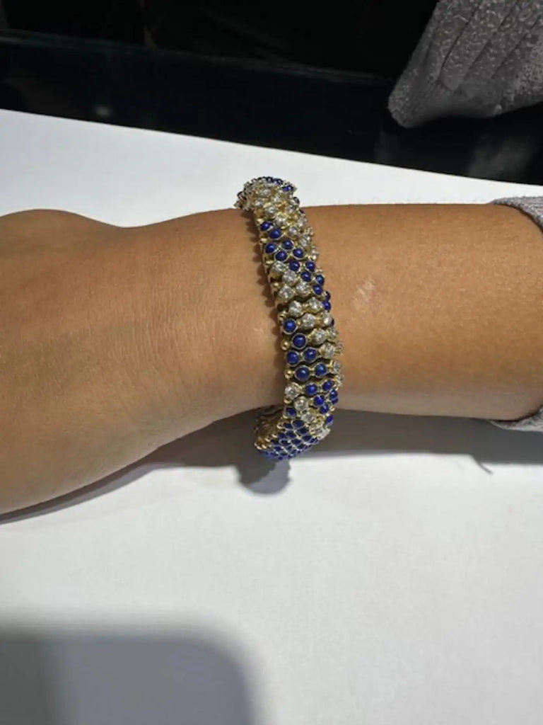 Rive Gauche JewelryBeautifully designed and masterfully handcrafted 1980s " Barber Pole " bracelet. Beautiful navy blue enamel domes set on a curve and spaced with bars of round brilliant cut diamonds give this bracelet a beautiful contrast of color. A wonderful feel on the wrist with amazing flexibility. Length 7.13 inches