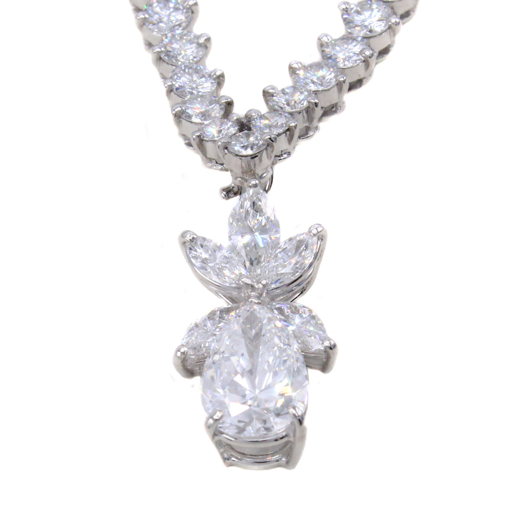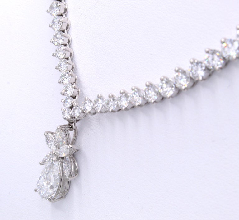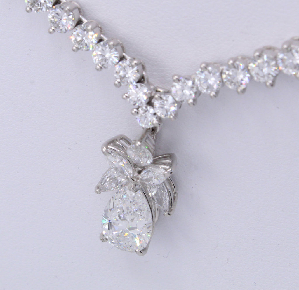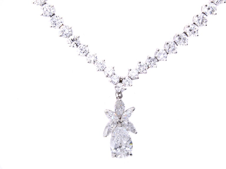 Rive Gauche JewelryBeautifully designed and masterfully handcrafted this magnificent French Riviera necklace has been set with the highest quality matching diamonds to ensure a unique flow of sparkling white around the neck. Set with 117 perfectly matched round brilliant cut diamonds in the necklace, with an average color of E-F and a clarity of VVS-VS give this magnificent necklace its fire and life. The total weight of the round diamonds is 18.34 carats. The flexible pendant part of the necklace is set with 5 marquis cut diamonds weighing 1.08 carats and with a beautifully shaped pear shape diamond weighing 2 carats which is accompanied by a report from the GIA giving it a color grade of D and a clarity of SI2. The total diamond weight in this necklace comes to 21.42 carats with each of the individual weights stamped on the back of the necklace and pendant. The pendant can be detached from the necklace as to be able to wear the Riviera to less formal occasions and the V-Shape construction ensures that this necklace will never tip or flip. French hall marks on the clasp