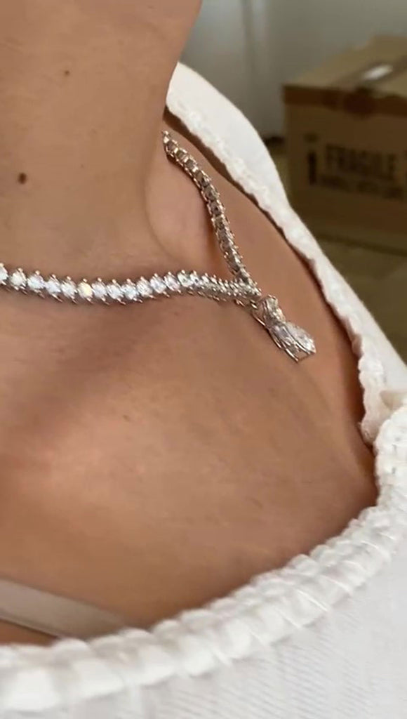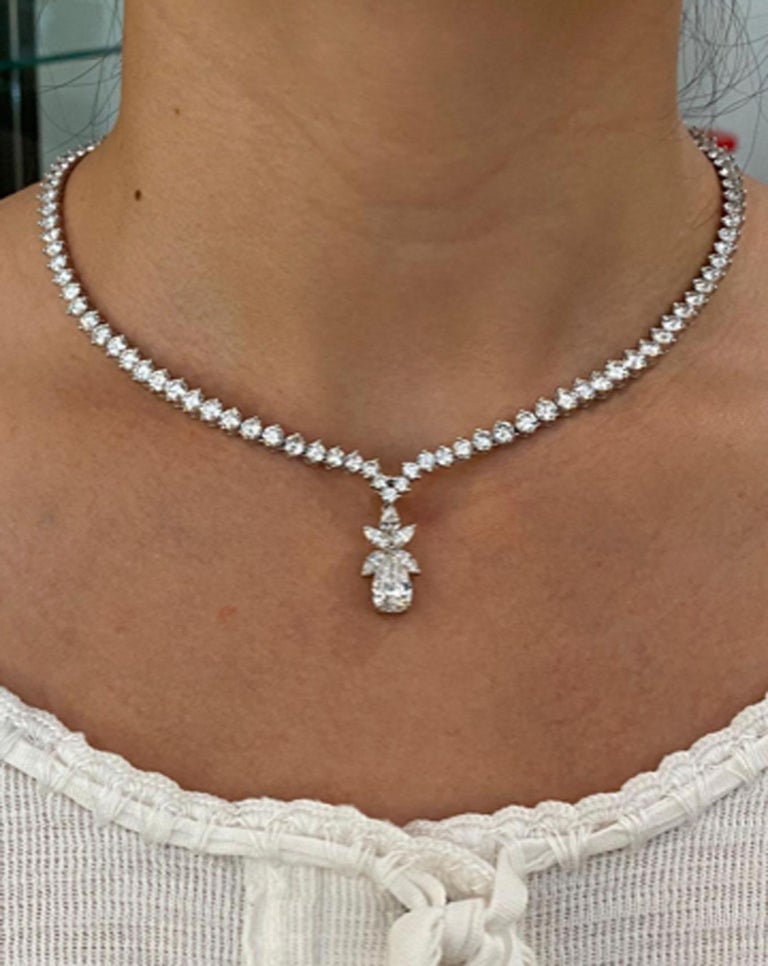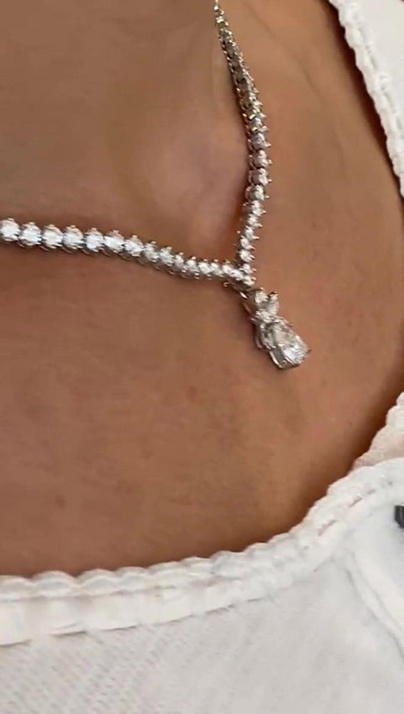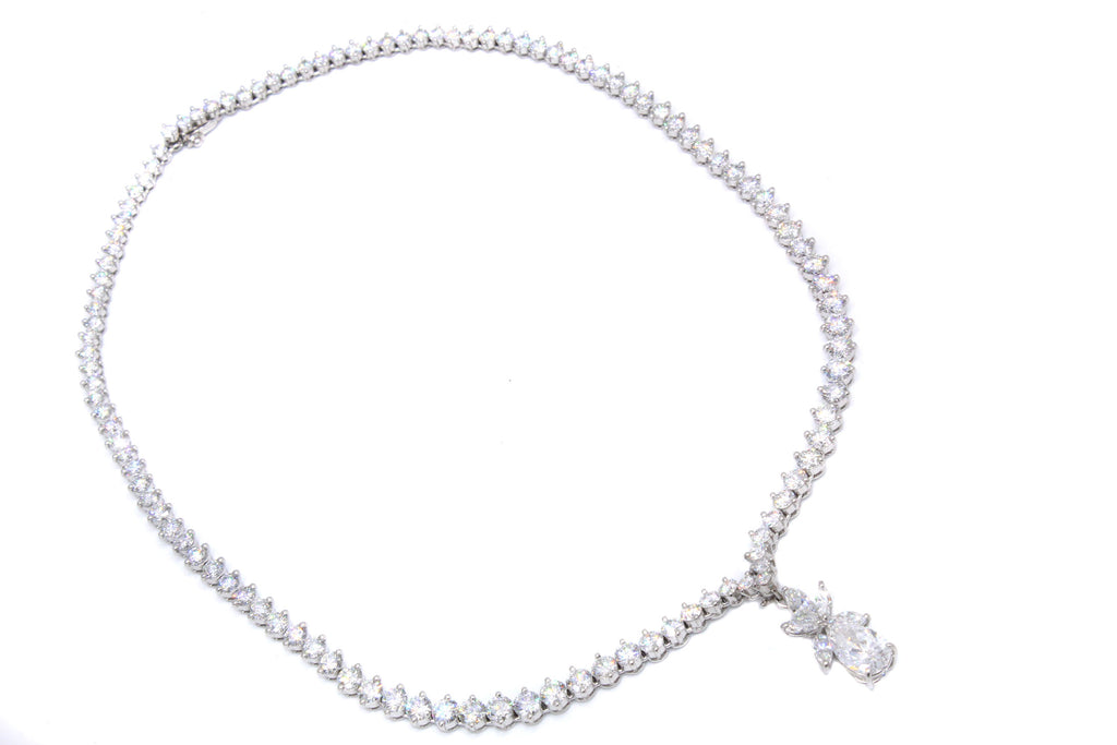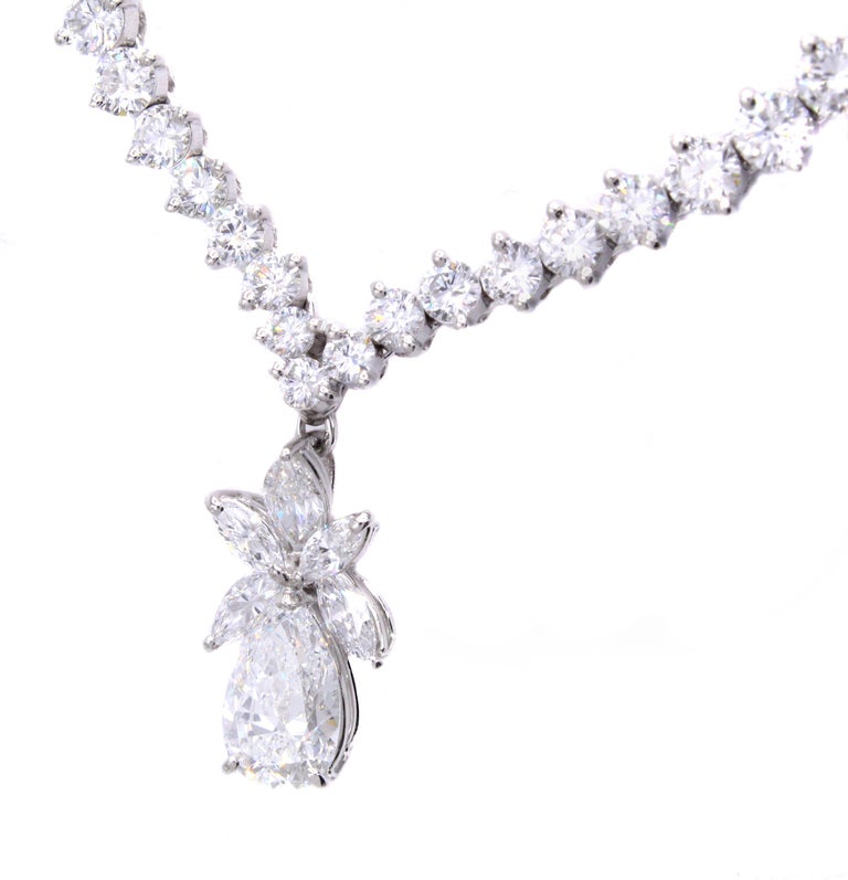 Rive Gauche JewelryBeautifully designed and masterfully handcrafted this magnificent French Riviera necklace has been set with the highest quality matching diamonds to ensure a unique flow of sparkling white around the neck. Set with 117 perfectly matched round brilliant cut diamonds in the necklace, with an average color of E-F and a clarity of VVS-VS give this magnificent necklace its fire and life. The total weight of the round diamonds is 18.34 carats. The flexible pendant part of the necklace is set with 5 marquis cut diamonds weighing 1.08 carats and with a beautifully shaped pear shape diamond weighing 2 carats which is accompanied by a report from the GIA giving it a color grade of D and a clarity of SI2. The total diamond weight in this necklace comes to 21.42 carats with each of the individual weights stamped on the back of the necklace and pendant. The pendant can be detached from the necklace as to be able to wear the Riviera to less formal occasions and the V-Shape construction ensures that this necklace will never tip or flip. French hall marks on the clasp