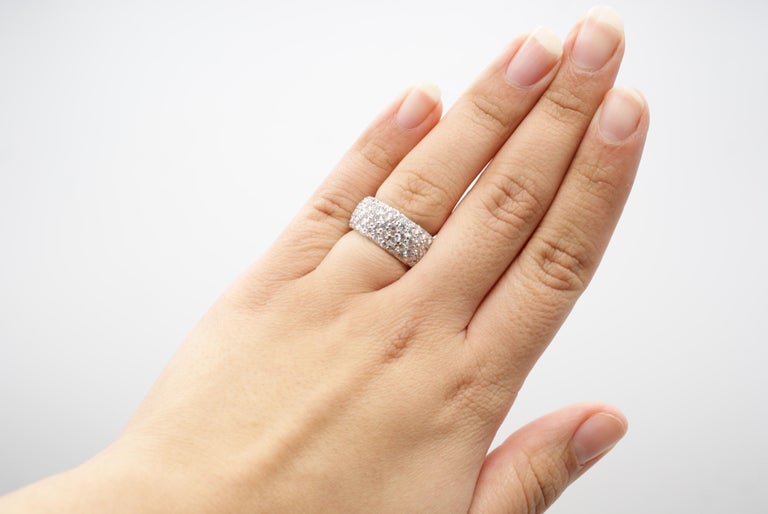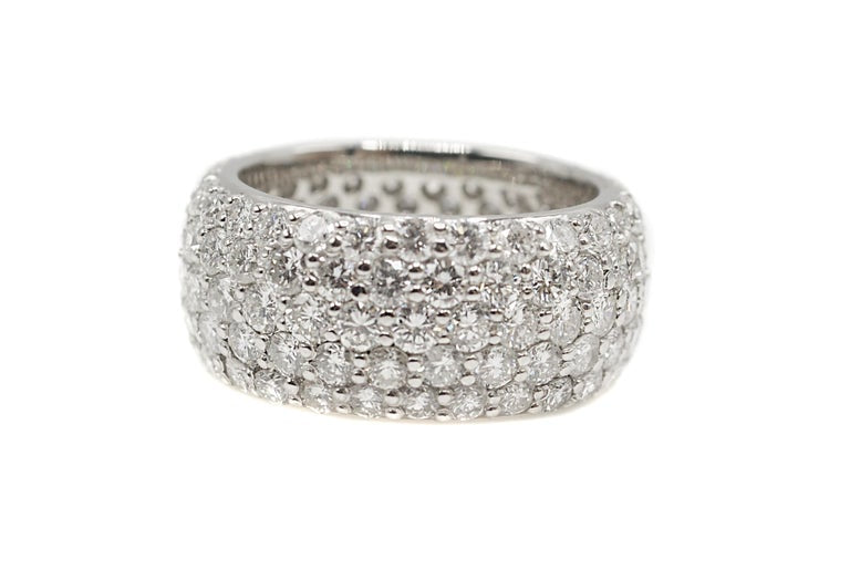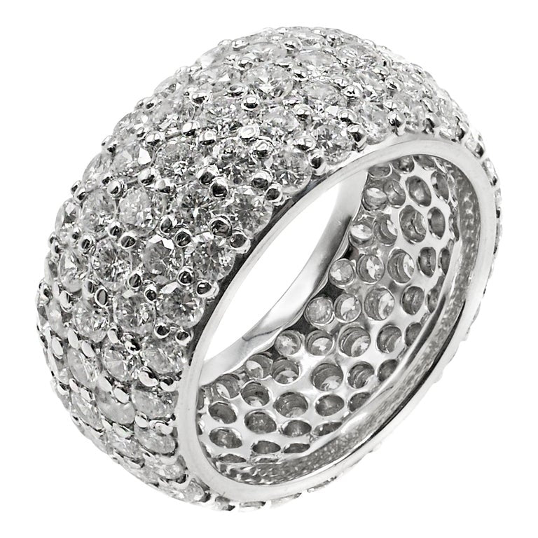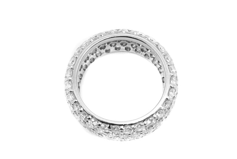 This impressive incredibly well hand-crafted eternity band is set with 135 white, bright and sparkly round brilliant cut diamonds. The 5 rows of diamonds which elegantly slightly curve over the finger are bead set with diamonds which are perfectly matched in color, clarity and cut to show off an amazing flow of brilliant white around the finger. The average color and clarity of the diamonds are E-F VS and the total diamond weight is 6 carats. Ring size is 6.5. Stamped on the inside PT900 for platinum and 6.00 for the diamond weight.