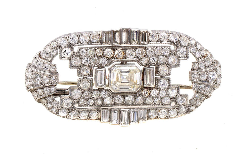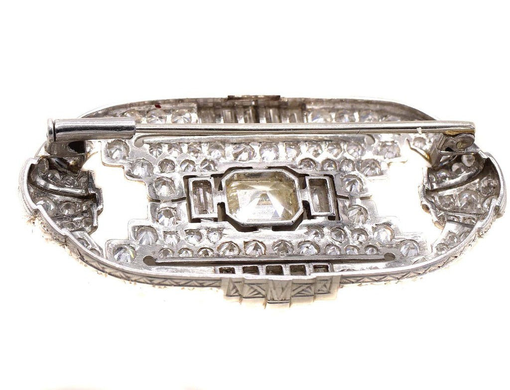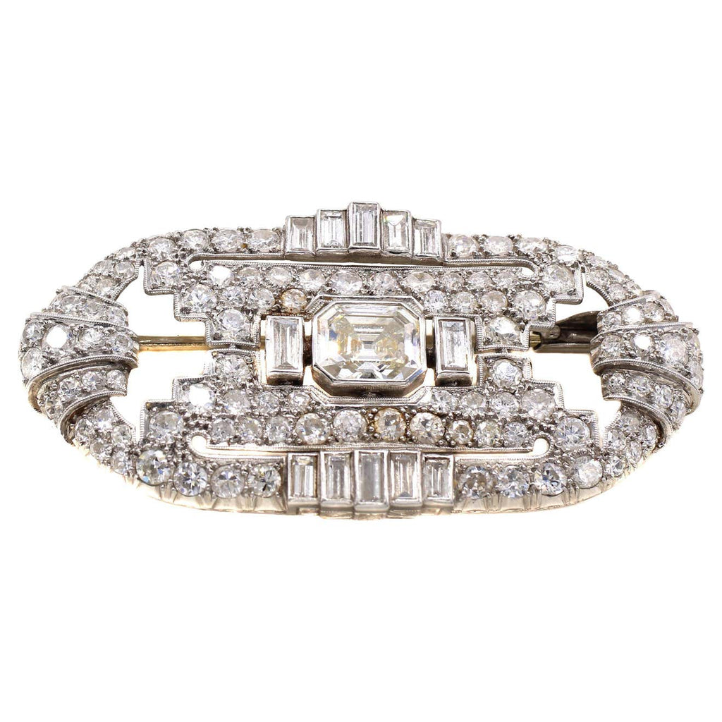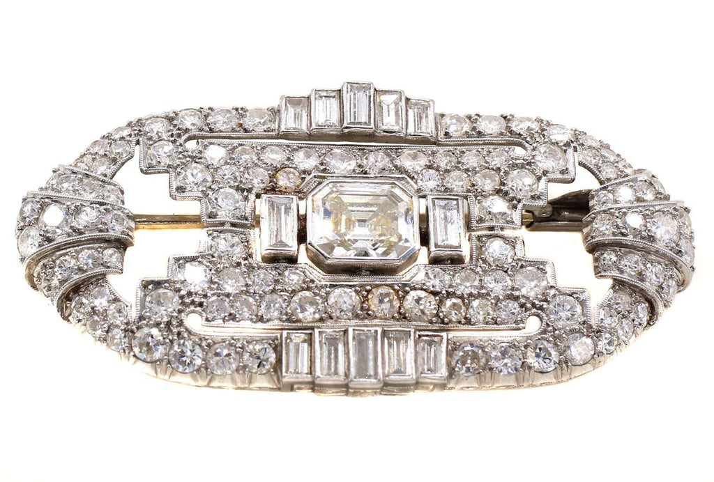 Rive Gauche JewelryMagnificently designed and masterfully handcrafted this Art Deco brooch from ca 1930 exhibits the geometrical design which was a signature of this period. Meticulously set with bright white Old European cut and baguette cut diamonds featuring a beautiful elongated Asscher Cut diamond as it's centerpiece. The central diamond has been measured to weigh approximately 1,90 carats and the balance of diamonds approximately 7 carats. A magnificent piece of fine period jewelry.