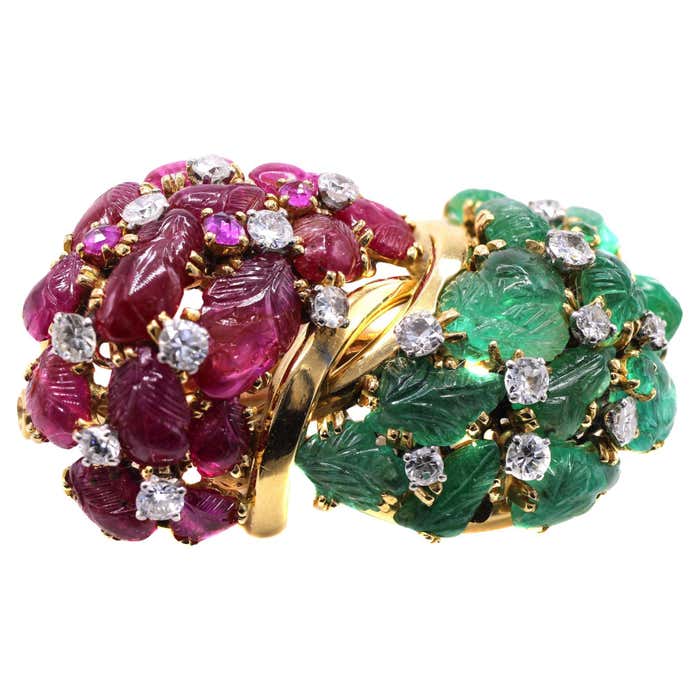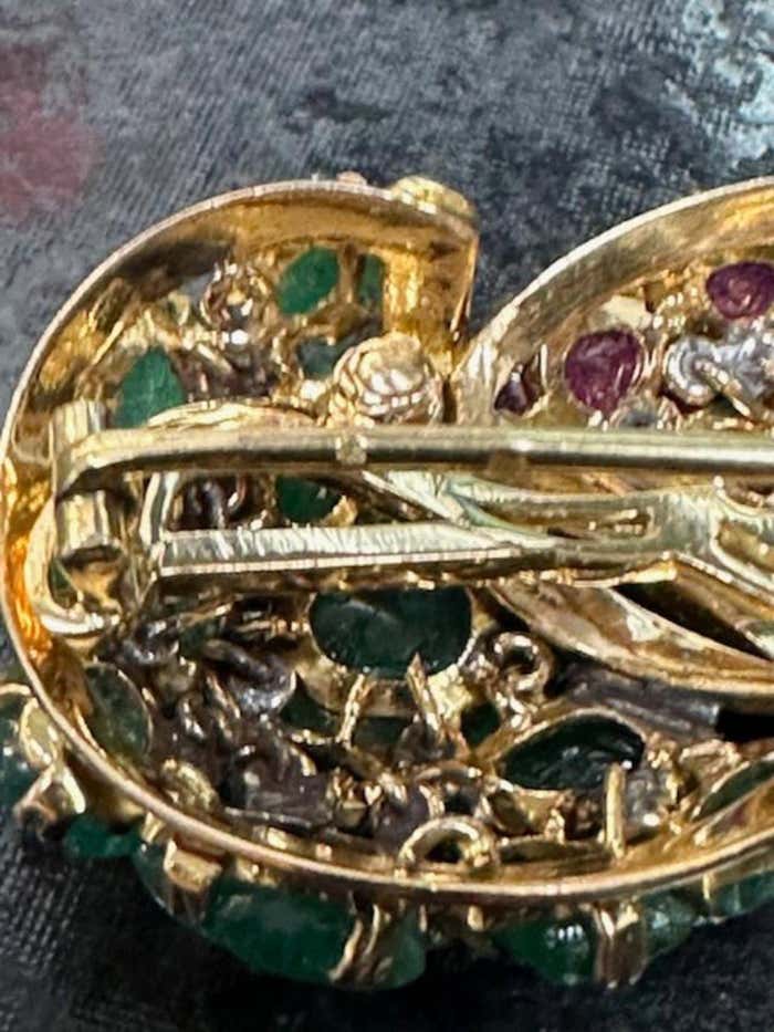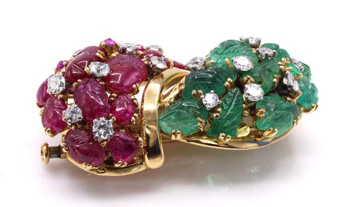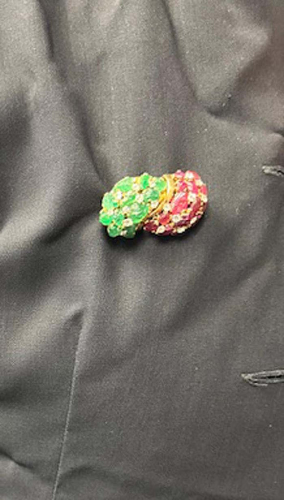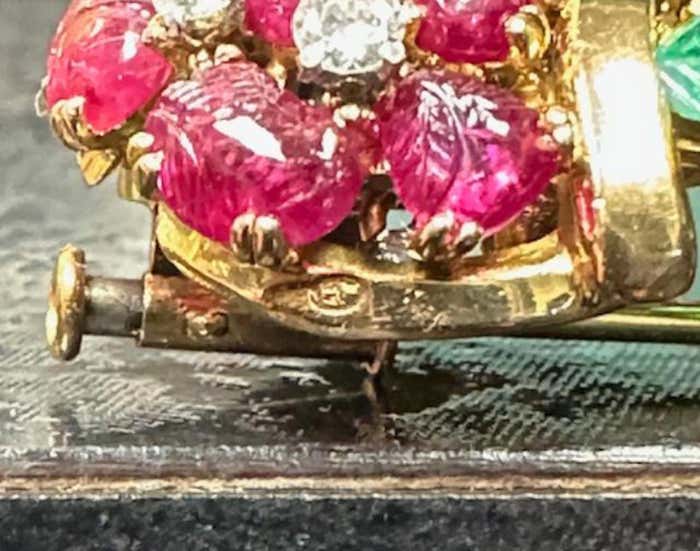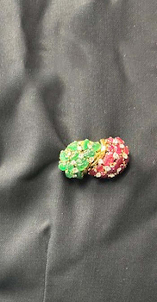 Beautifully designed and masterfully handcrafted in 18-karat yellow gold. This chic and charming French retro brooch from ca 1940 in the shape of Alpha-Omega is set with beautiful forest green carved emeralds on one side and vibrant red carved rubies on the other. Spaced by bright white and lively round diamonds on a slightly rose-colored 18-carat gold gallery. The sides and pin are stamped with French assay marks and maker marks. A lovely piece of most wearable period jewelry. Width: 0.8 in (20.32 mm)Length: 1.5 in (38.1 mm)