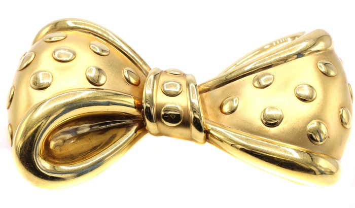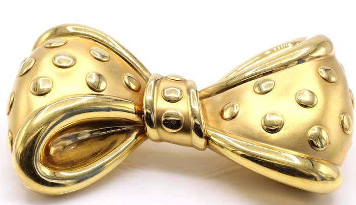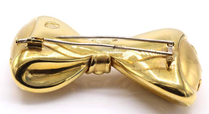Beautifully designed and masterfully handcrafted in an 18-karat yellow gold bow brooch. The wonderful three-dimensional design with a mixture of mat and polished gold gives this lovely brooch its unique look. Signed VCA France and French hallmarks on pins.