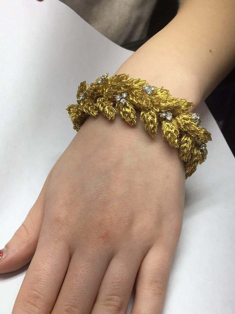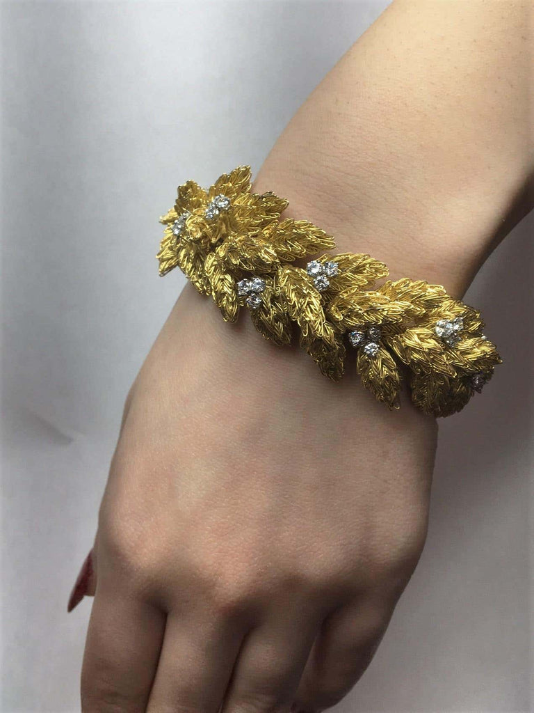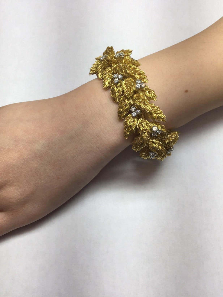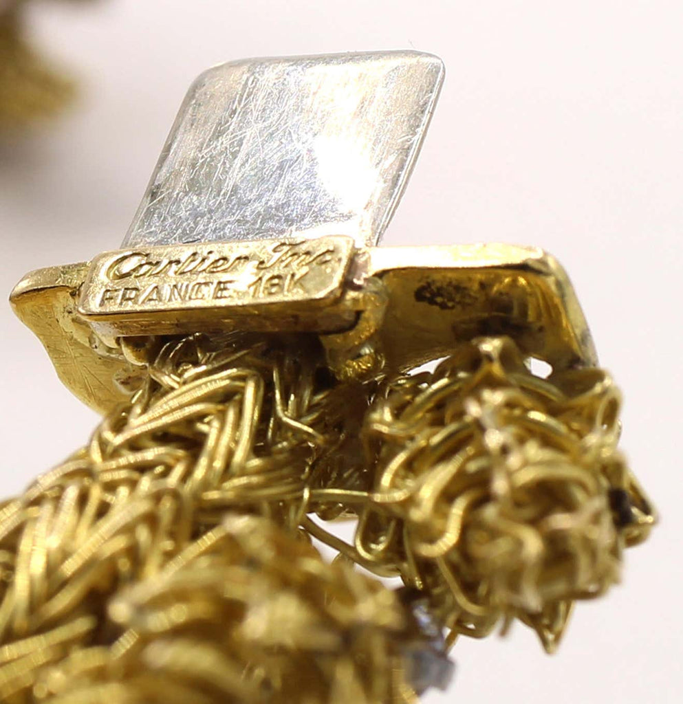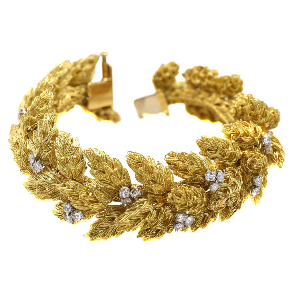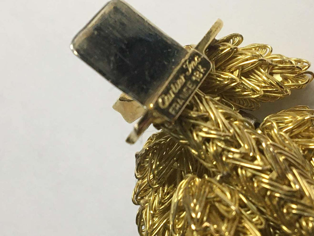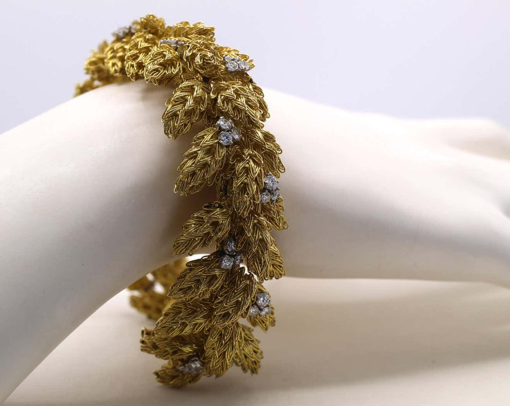 Magnificently designed and exceptionally well handcrafted, this unique 1970s bracelet has been fashioned to appear like a bed of feathers on the wrist. Literally, thousands of fine handcrafted gold wires have been assembled into 48 elements on various levels to create an amazing 3-dimensional work of art. Spaced in intervals with sections of 3 bright white and sparkling round brilliant cut diamonds giving the bracelet a wonderful contrast of color. An amazing piece of period jewelry by one of the most renowned jewelers in the world. Signed Cartier Inc France, numbered, assay marks. 18K Gold.