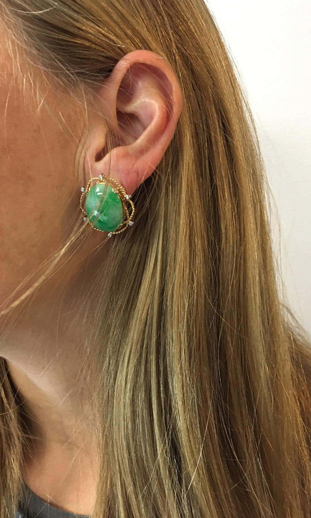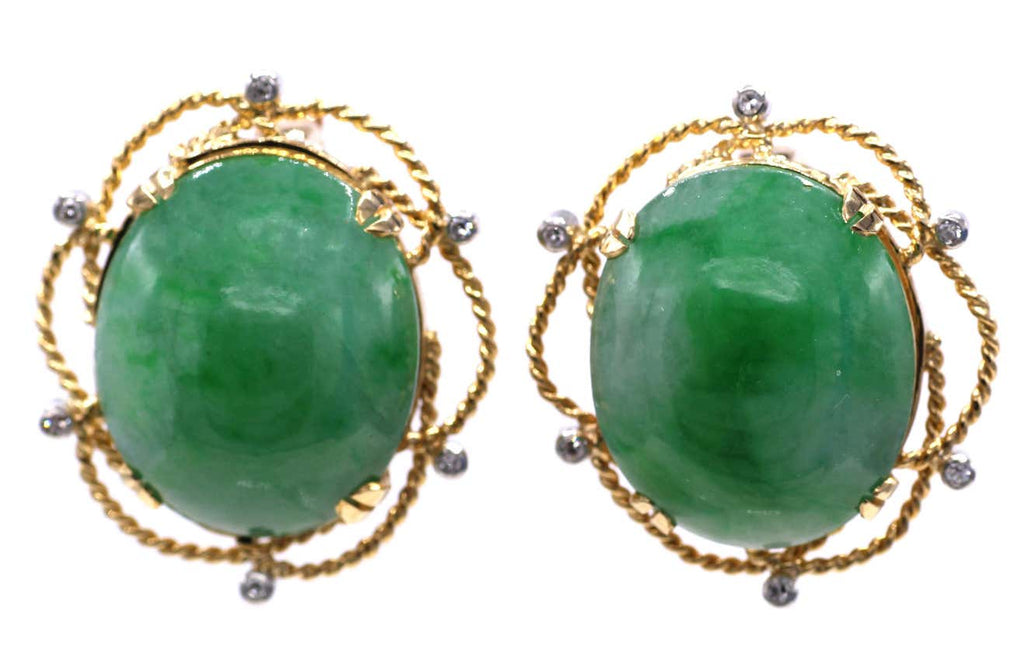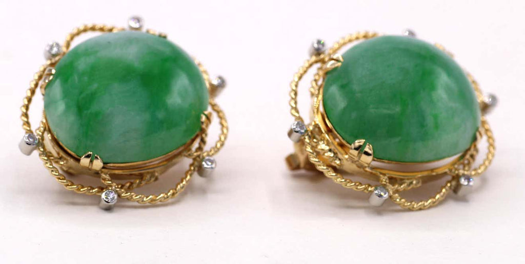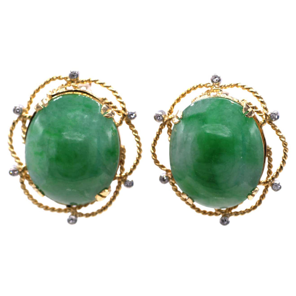 Rive Gauche JewelryBeautifully designed and masterfully handcrafted 1970s ear clips by Cartier Paris worked in 18 karat yellow gold. 2 large jade cabochons measuring approximately 20 x 16 millimeters each are the centerpiece of these chic earrings embellished by braided gold wire and spaced by small round diamonds set in white gold. Lever clip backs stamped " Monture Cartier " with makers mark for Cartier , numbered and French hallmarks. Height 1 inch, width 0.9 inches.