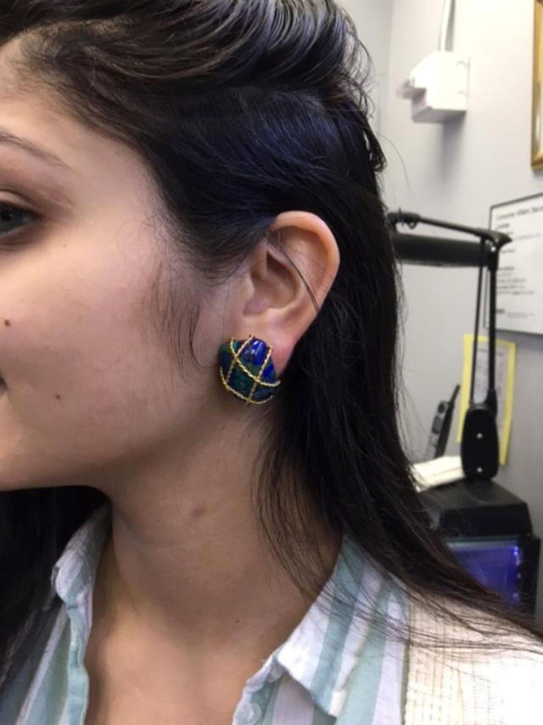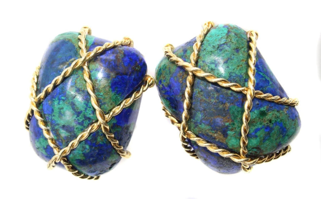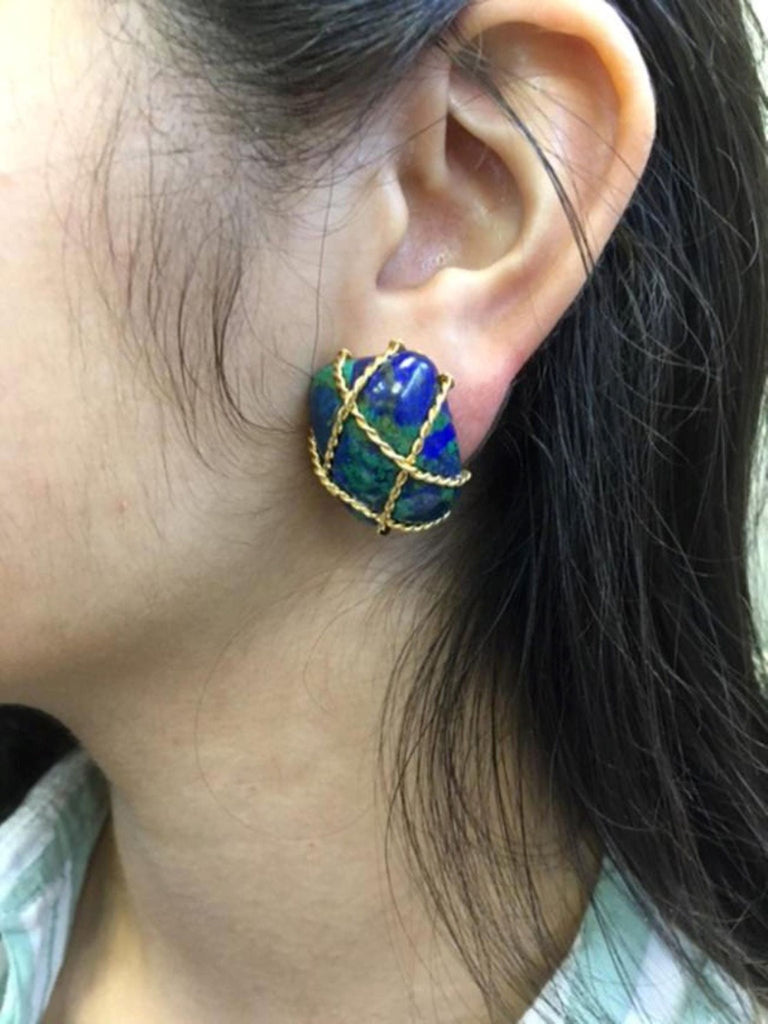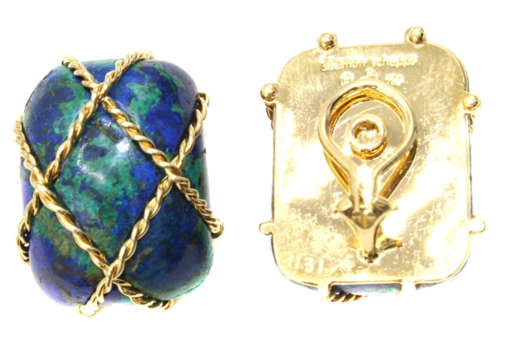 Rive Gauche JewelryA large rectangular labradorite cabochon is the centerpiece of this classic and most fashionable earring by the renown American Jeweler Seaman Schepps. Patches of royal blue und turquoise make give this gemstone an intriguing and colorful appearance on the ear. Set in a cage-like pattern of 18 karat braided goldwork give the earring it's chic look. The earring is signed on the back Seaman Schepps 750 and stamped with the shell as the makers mark. Width 19 mm Length 29mm