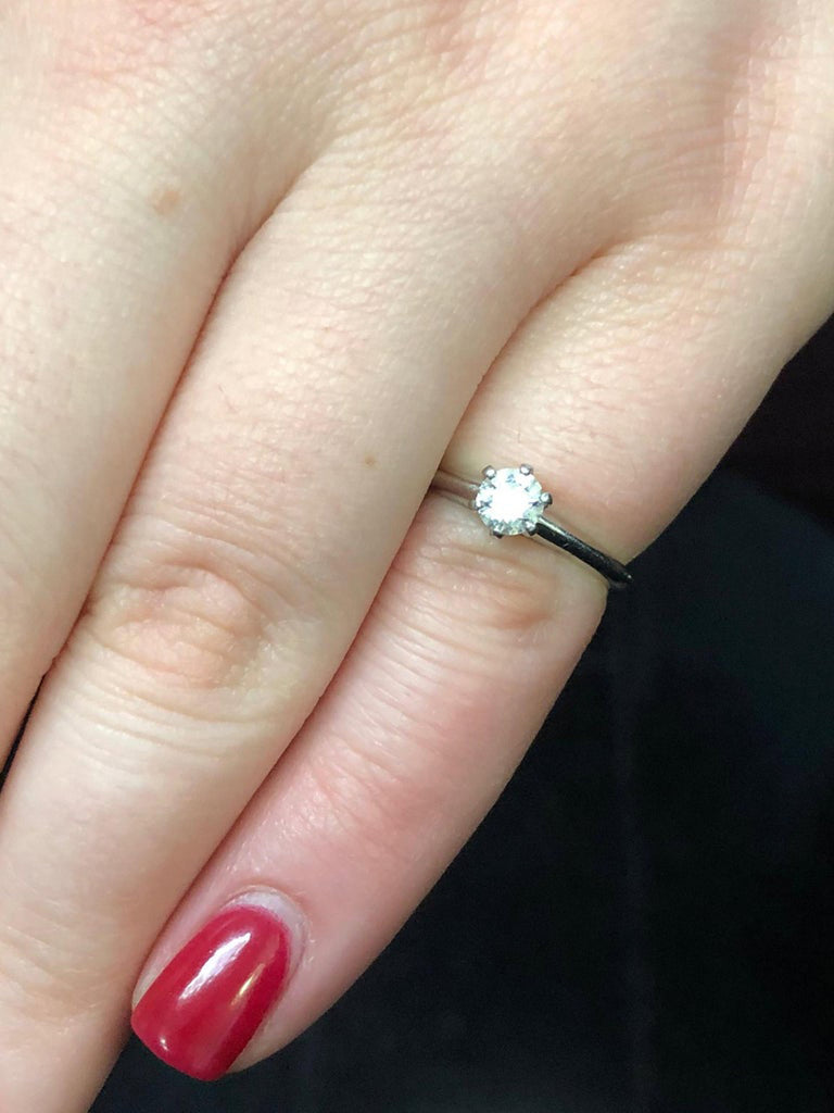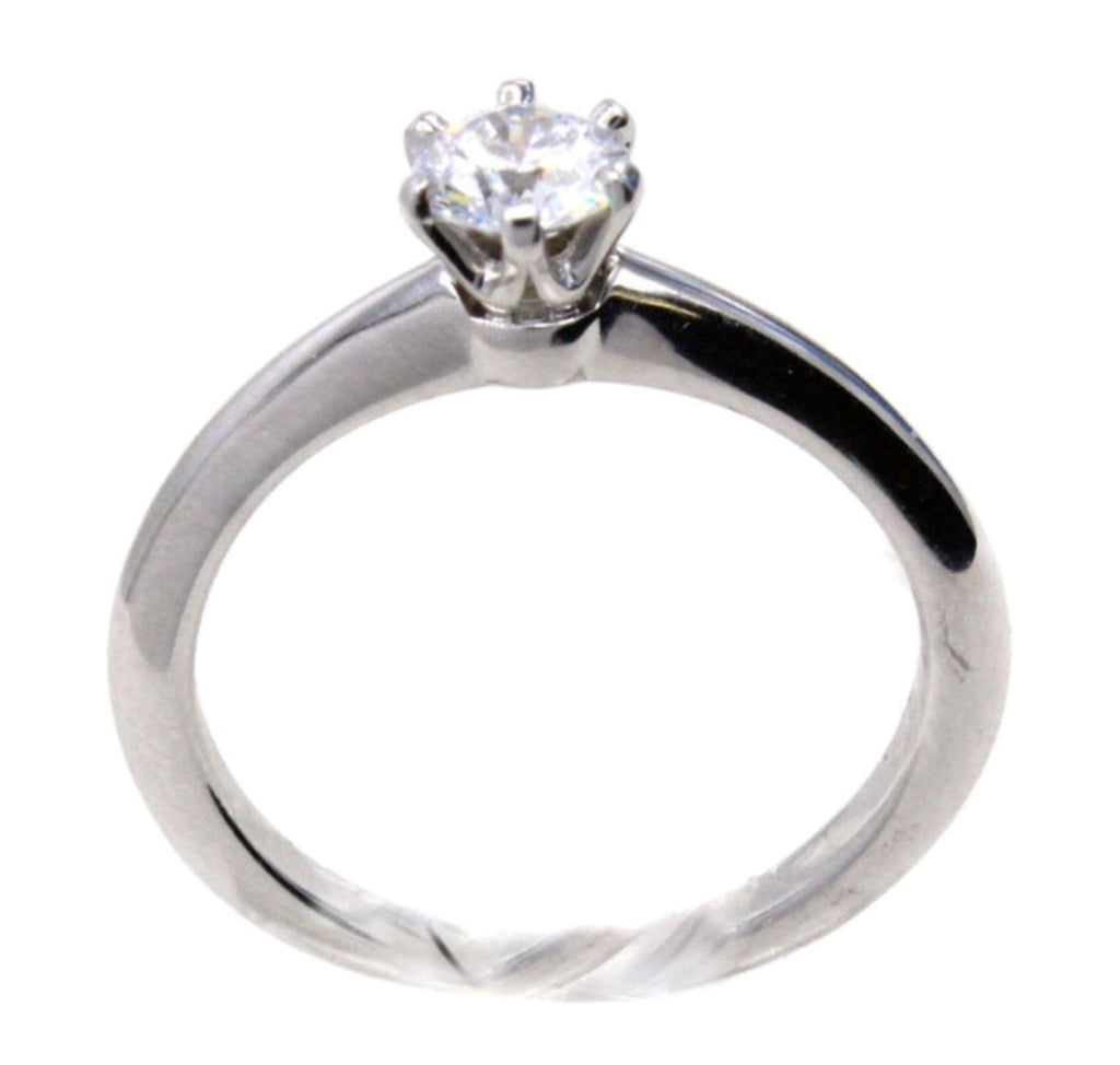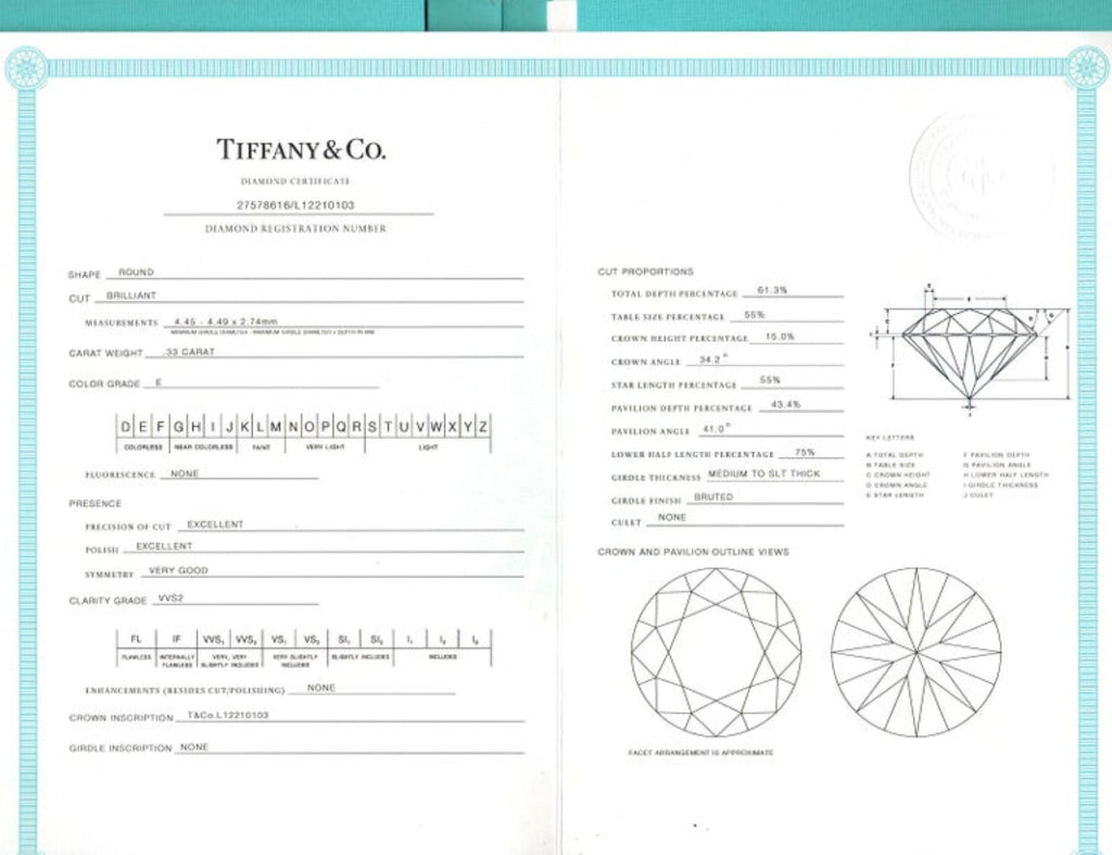 Rive Gauche JewelryPlatinum handcrafted mounting by Tiffany & Co. featuring a perfect round brilliant cut diamond secured by 6 prongs. The central diamond is accompanied by a Tiffany certificate stating the color as E and the clarity as VVS2. Signed on the inside of the shank Tiffany & Co, PT950, the weight of the diamond 0.33 carats and the Tiffany report number. The ring comes within the original blue suede ring box and outer turquoise blue card board box.