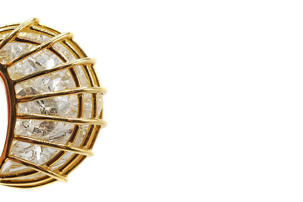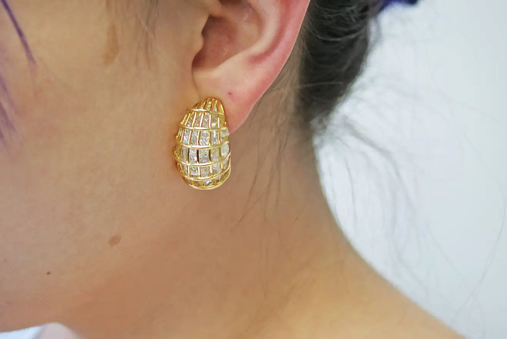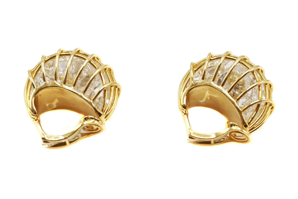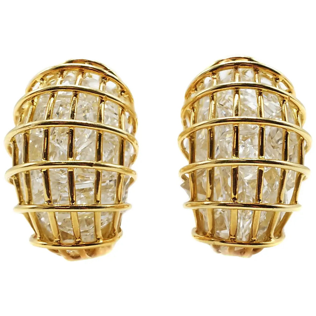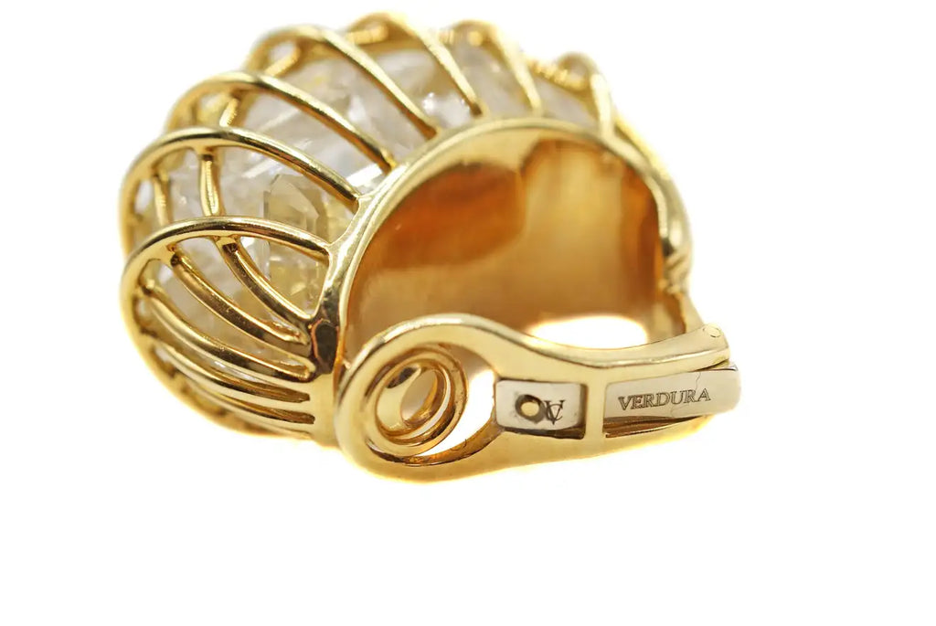 This pair of classic Verdura ear clips from their " Cage " collection exhibits this famous jeweler's fantastic creativity and workmanship. Fine 18-karat golden polished curved bars form a virtual cage filled with rock crystal cut into various diamond cuts such as the round brilliant, baguette, emerald, pear, and kite shapes. This elegant and intriguing look gives this earring a wonderful contrast and sparkle on the ear. Constructed with the perfect weight and luxurious omega spring backs, they make for the most comfortable wear. These earrings are signed Verdura and have maker's marks on their backs.