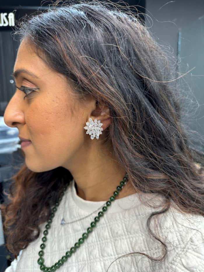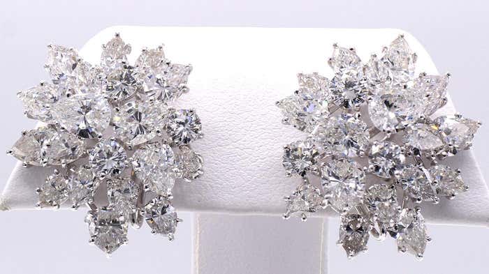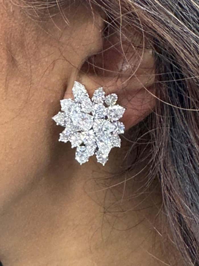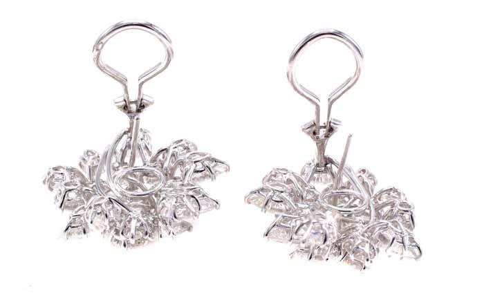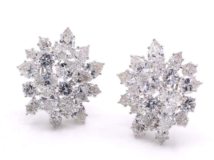 Beautifully designed and masterfully handcrafted in platinum, these important Winston-style diamond ear clips are beautifully set on multi-levels to give them a magnificent three-dimensional appearance on the ear. Set with 30 pear-shaped diamonds and 6 round brilliant cut diamonds, all perfectly matched in color and clarity, these wonderful earrings live and sparkle on the ear. With the largest pear shape diamond measuring approximately 0.70 carats, the approximate total diamond weight has been calculated at 13.5 carats. The average colors range from E to G with an average clarity of VVS to VS. A large omega clip and a post secure the ear clips. A curved wire is on the back of the earring, so one can hand a diamond or gemstone to make this an elegant nighttime earring. Width: 1 in (25.4 mm)Length: 1 in (25.4 mm)