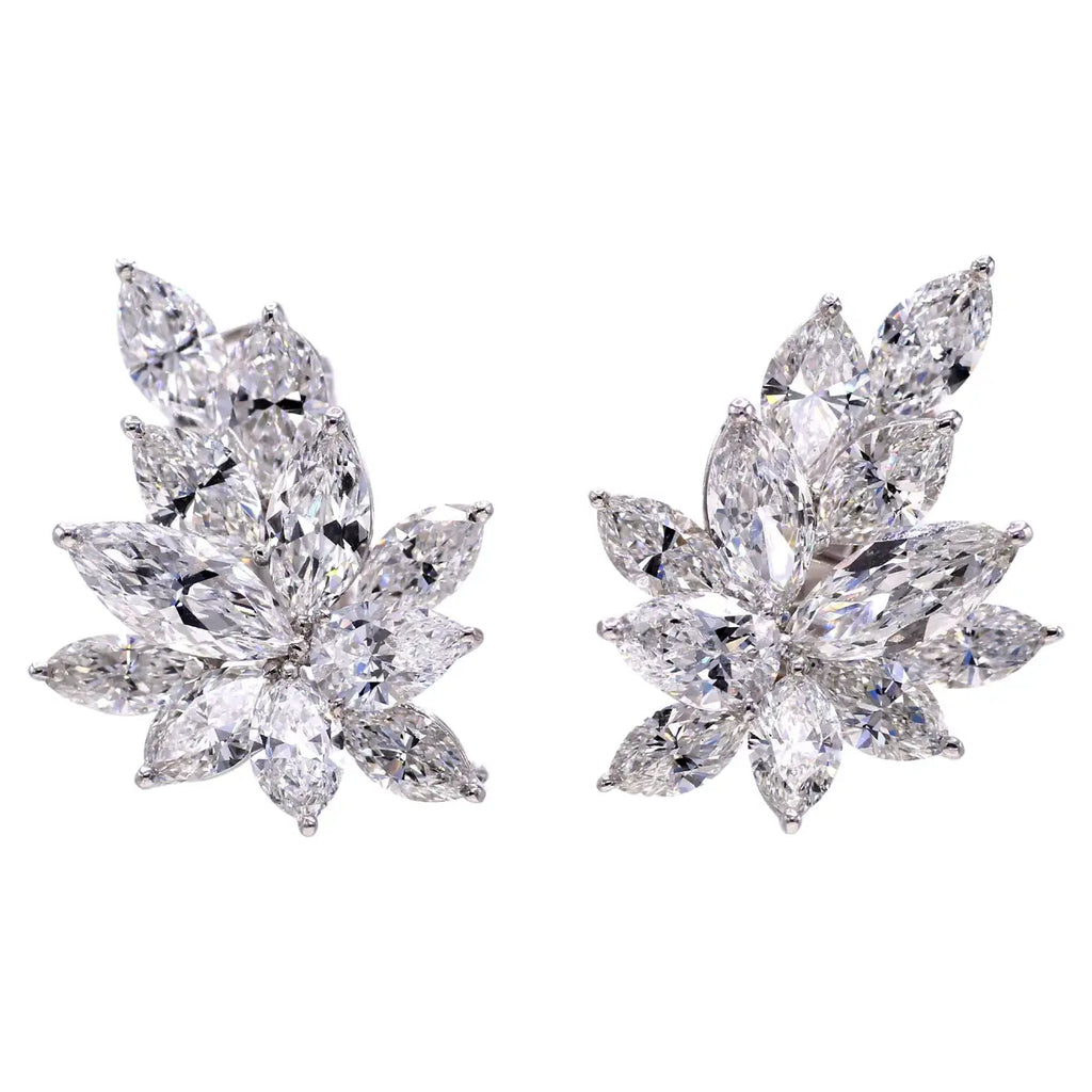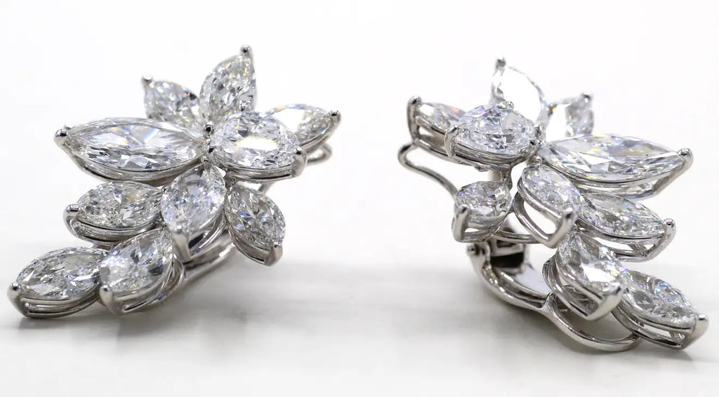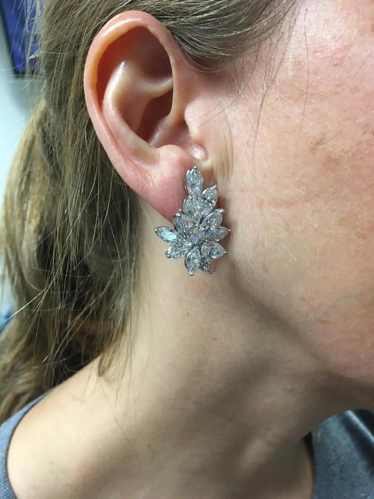 Rive Gauche JewelryAmazing Winston style platinum diamond ear clips set with a total of 22 - 11 in each earring - marquis shape diamonds with a total weight of 16.58 carats. All diamonds are accompanied by reports from the GIA with only the top colors D, E and F. Masterfully handcrafted wide omega clip-backs secure these ear clips, and a post can be added if desired. A stunning piece of sparkling white jewelry on every ear.