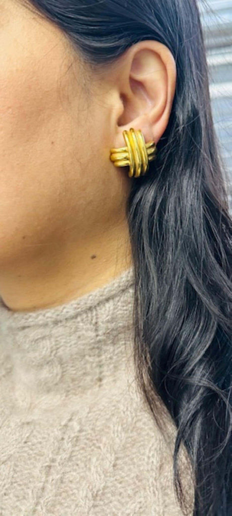 Stylish chic 18 karat yellow gold ear clips in the shape of an "X" by Tiffany & Co. The polished gold overlapping triple bands display a beautiful three-dimensional look on the ear for everyday wear. Signed T&Co. Width: 1.05 in (26.67 mm)Length: 4 in (101.6 mm). 23.1 grams,