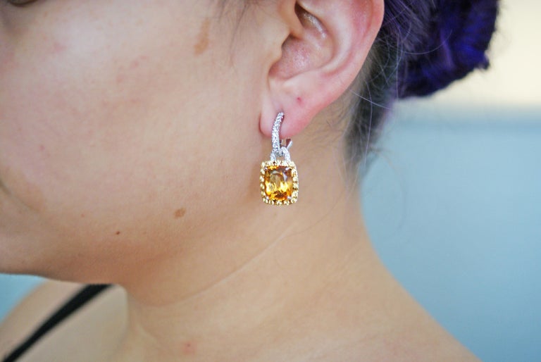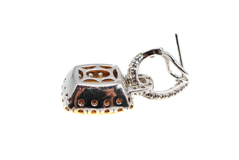 Beautifully designed and finely hand-crafted, these elegant ear pendants feature a pair of perfectly matched bright orange Citrines. The 2 cushion cut gems are measured to weigh approximately 5.5 carats, with a total weight of approximately 11 carats. A bezel set with 18 smaller brilliant yellow citrines surround the the cushions and a white gold bail connects to the top flexibly all set with bright white and sparkly round brilliant cut diamonds. A magnificent contrast of colors all set in 18 karat white gold make for a fun and chic wear. Magnificently crafted these ear pendants are light to assure a most comfortable earring.