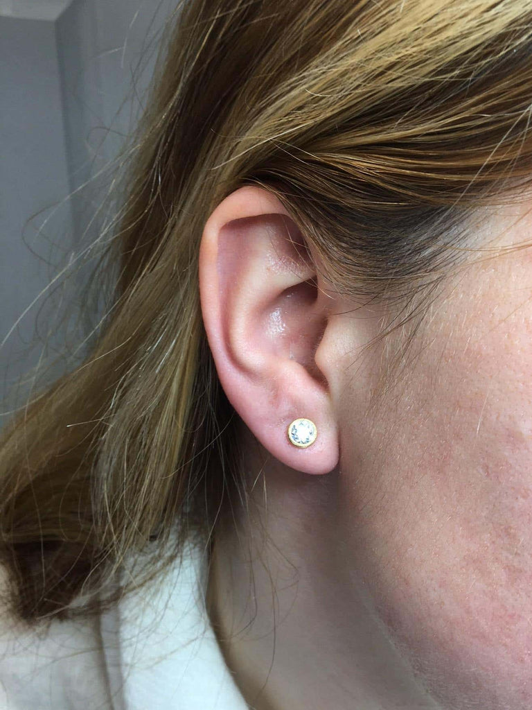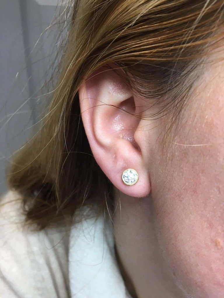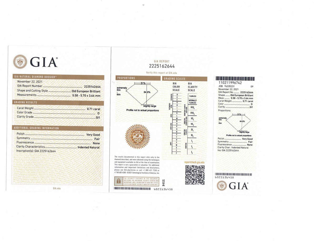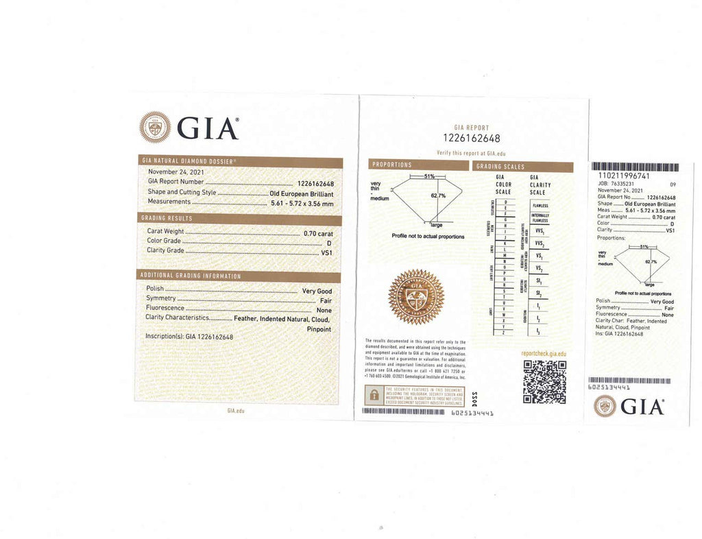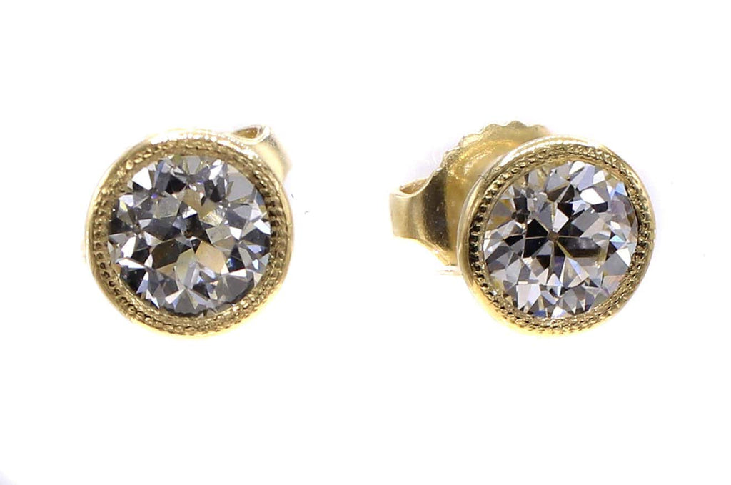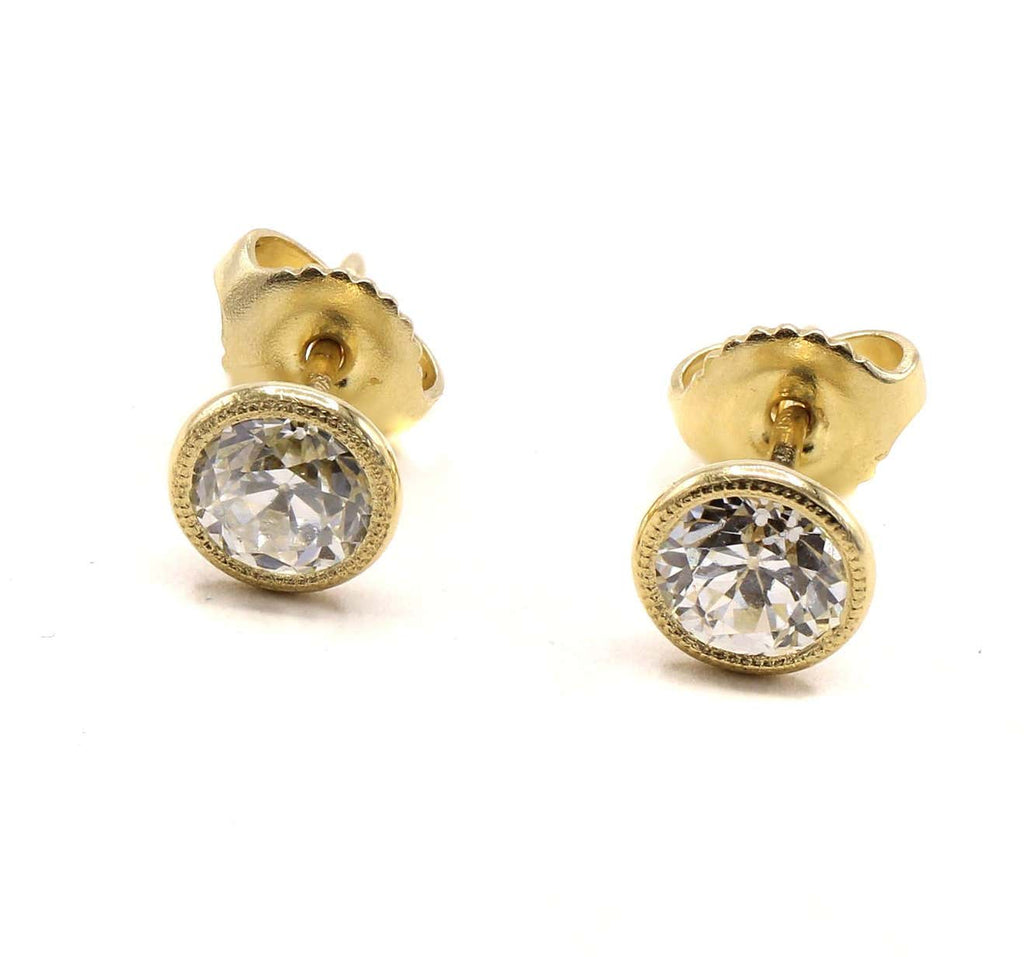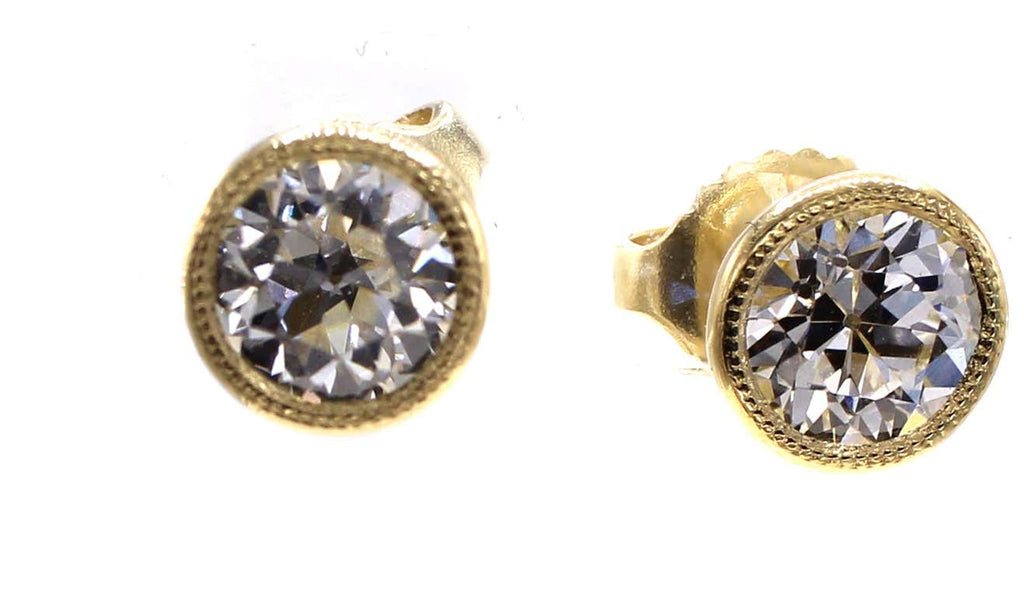Rive Gauche JewelryTwo charming Old European Cut diamonds with a total weight of 1.41 carats have been set into these handcrafted 18-karat white gold bezel set mountings. The tops of the bezels have fine milligrain work combining the new world with the old cuts from a former era. The diamonds face up very white and have an extremely pleasant brilliance. The diamonds naturally face up very white, having the highest color grade of D, and have an extremely good brilliance and fire. Perfectly matched in diameter, table, depth, and color, they are the perfect pair of diamond stud earrings. Accompanied by reports from the GIA giving them both the highest color grade of D and clarities of VS1 and SI1. Custom designed and created by Rive Gauche Jewelry.