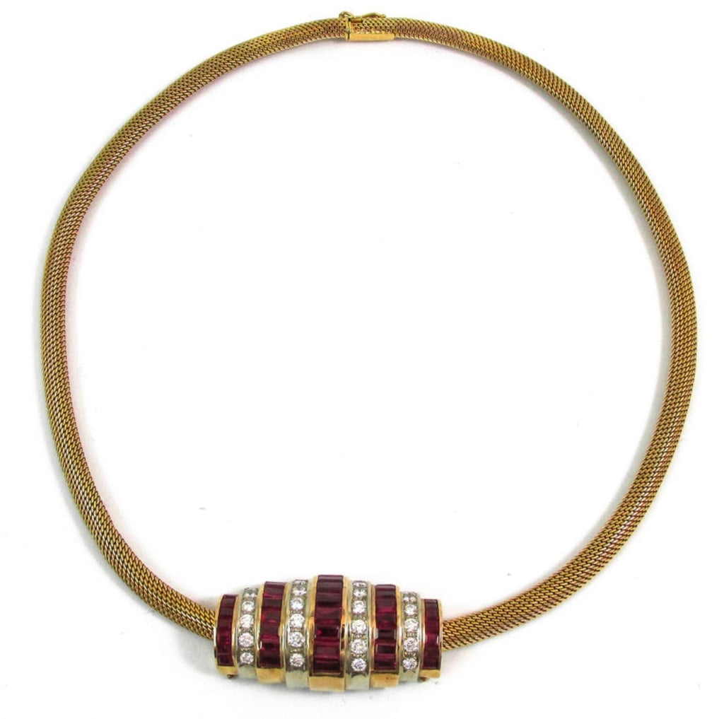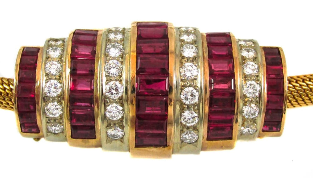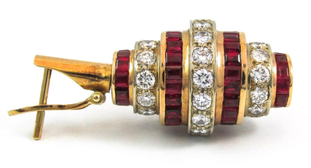 Rive Gauche JewelryThe unique design inspired by the avantgarde style of the Retro era was the creation the proprietor while living in Germany in the 1970ies. Known for their amazing craftsmanship the jewelry shop was inspired to make this suite into the masterpiece it is now. The barrel-shaped earrings were crafted into circular discs starting with one channel set with deep lush red beautiful step-cut Burma rubies with the next disc alternating with bright white and sparkly round brilliant cut diamonds. To give these earrings more contrast, the diamonds where set in white gold while the rubies are set in yellow gold. The extended curved polished gold tube which hides the clip-back is flexible to the bottom of the earring, giving it movement on the ear.
