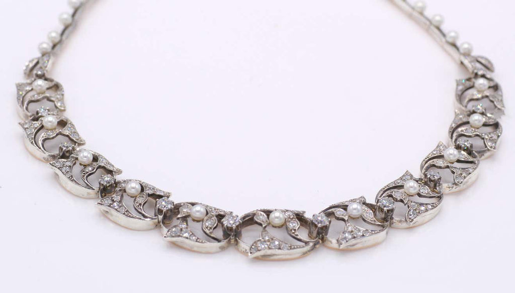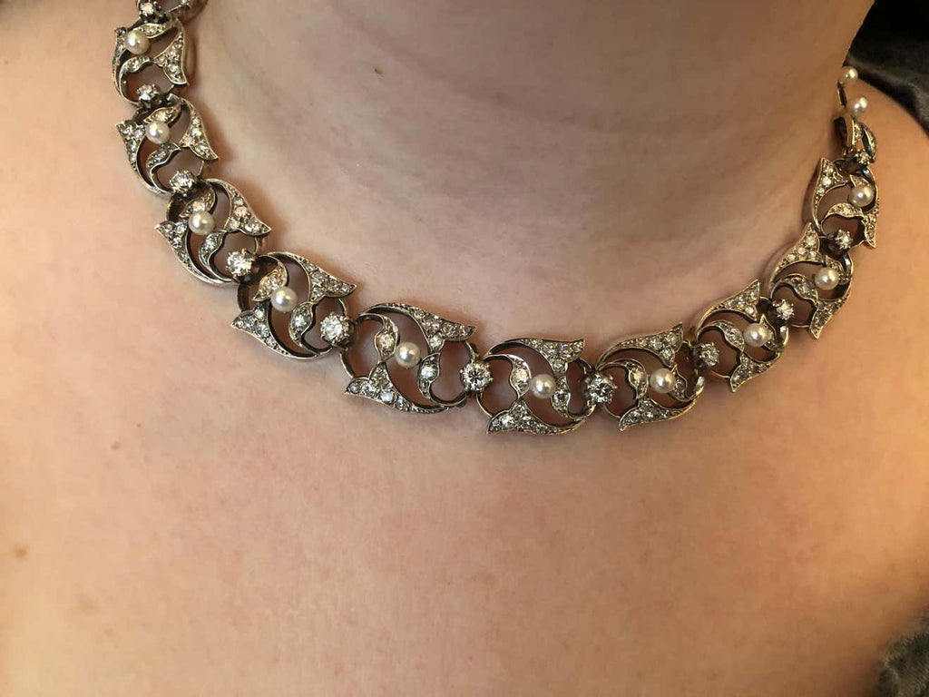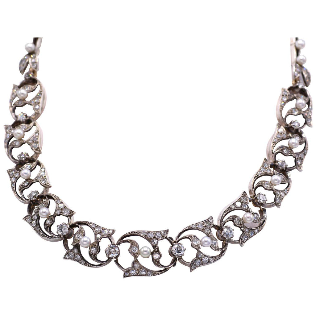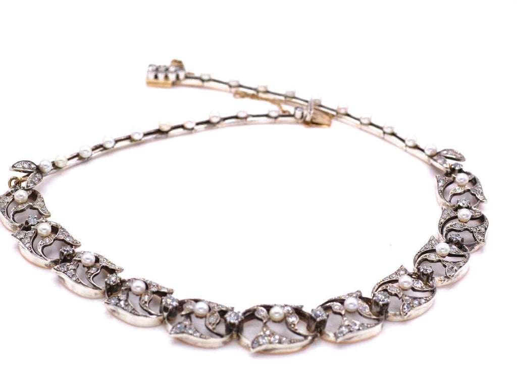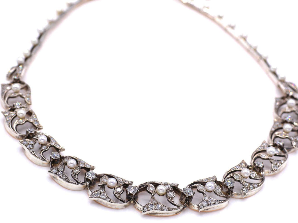 Beautifully designed and masterfully handcrafted in silver topped 18 karat gold, this French antique necklace from ca 1870 is a unique piece of period jewelry. Set with 21 perfectly matched white and lustrous pearls and embellished with bright white and lively old cut round diamonds this necklace is a festive and glamorous wear. The 11 central elements are flexibly connected, which fit elegantly around the neck, and the ends fashioned as double bars set with pearls fit on the back of the neck. French assay marks and makers mark on the clasp.