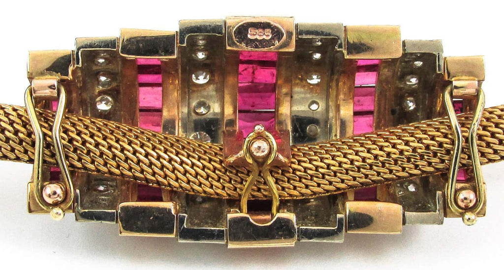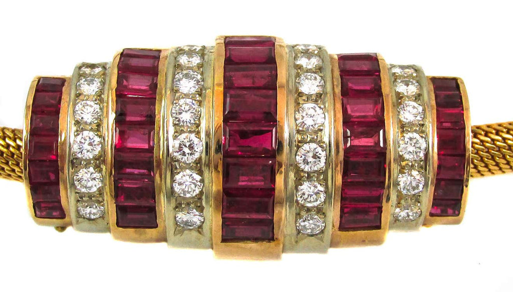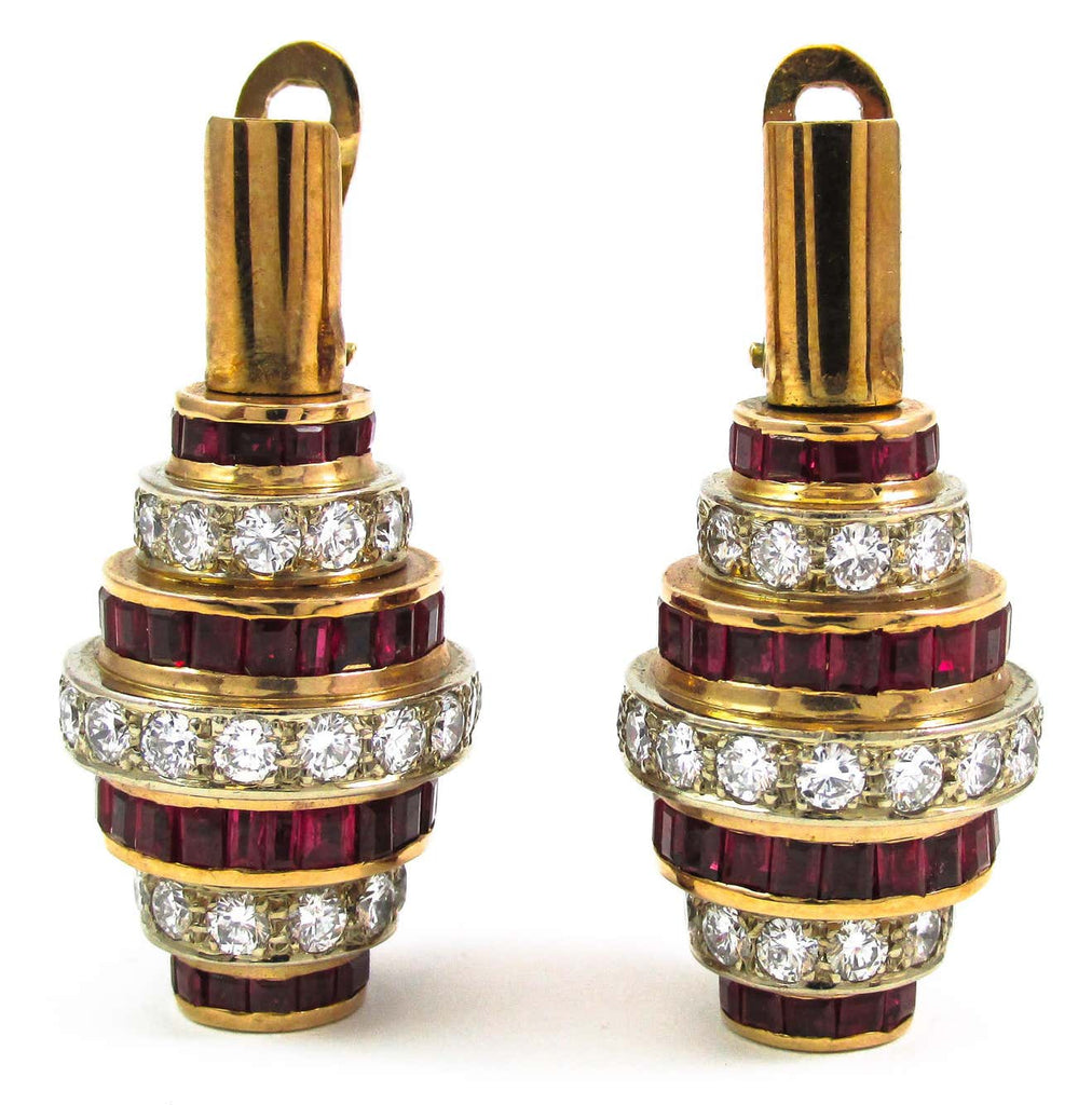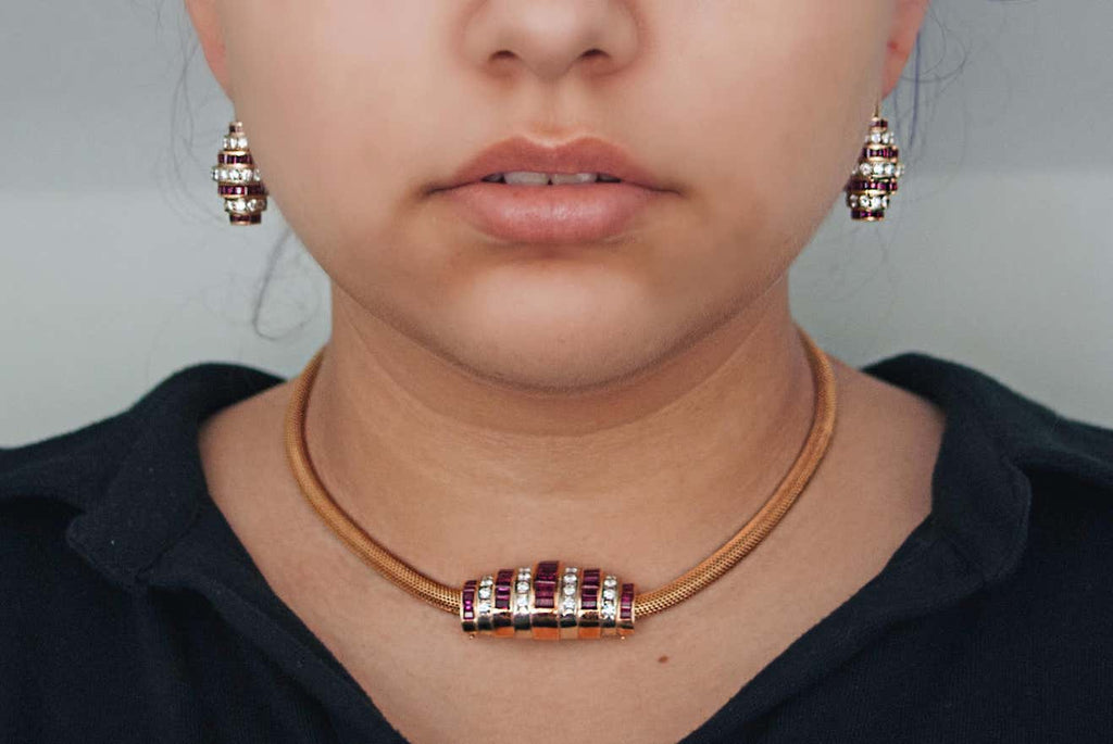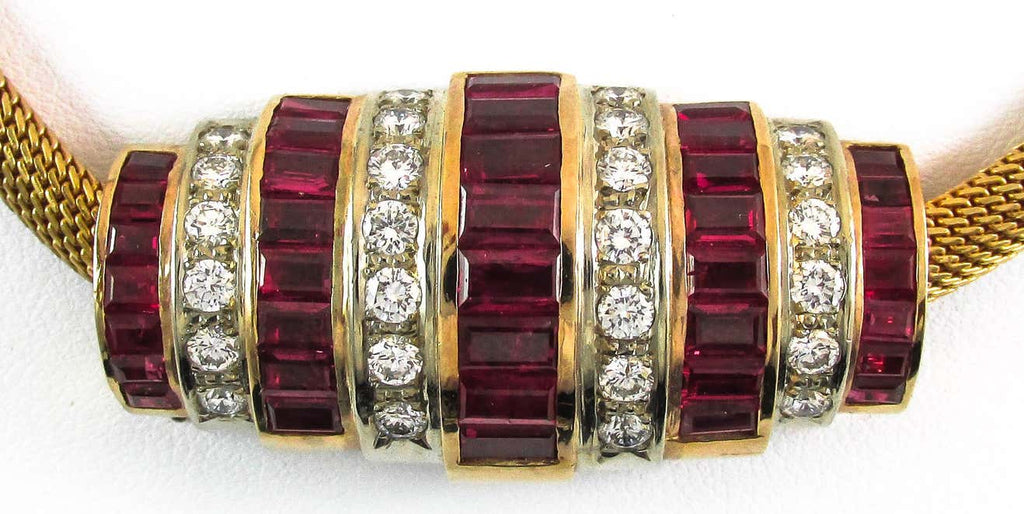 Rive Gauche JewelryThe unique design inspired by the avant-garde style of the Retro era was the creation of the proprietor while living in Germany in the 1970s. Known for its amazing craftsmanship, the jewelry shop was inspired to make this suite into the masterpiece it is now. The barrel-shaped earrings were crafted into circular discs starting with one channel set with deep lush red beautiful step-cut Burma rubies with the next disc alternating with bright white and sparkly round brilliant cut diamonds. To give these earrings more contrast, the diamonds were set in white gold, while the rubies were set in yellow gold. The extended curved, polished gold tube which hides the clip-back is flexible to the bottom of the earring, giving it movement on the ear. This same cool style was repeated on the central necklace ornament, which is clipped on so that the chain can also be worn on its own for more casual occasions.. - Necklace 26 round brilliant cut diamonds weighing approximately 1.60cts total - Necklace 38 step cut rubies weighing approximately 8cts total - Necklace 16.5“ long x 3/16” wide - Pendant 1.5” long x 0.75“ wide - Pendant stamped 585 - Chain forged 750, makers mark - Necklace 56.1 grams / 36.1 dwt - Earrings 60 round brilliant cut diamonds weighing approximately 4.80cts total - Earrings 50 step cut rubies weighing approximately 6.25cts total - Earrings 1-3/8“ long x 0.5“wide - Earrings stamped 585 - Earrings 25.3 grams / 16.3dwt