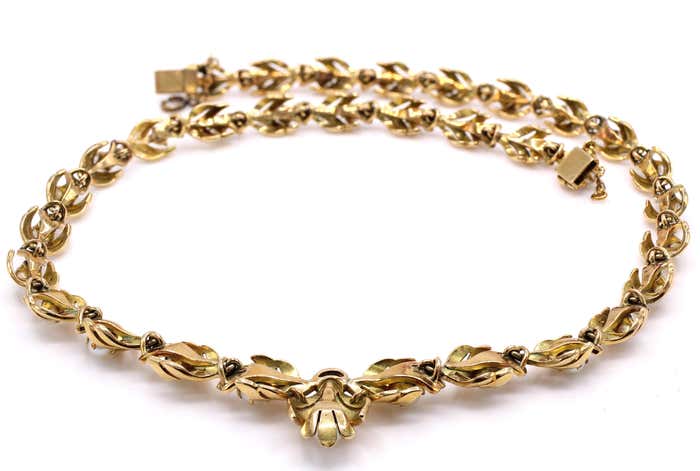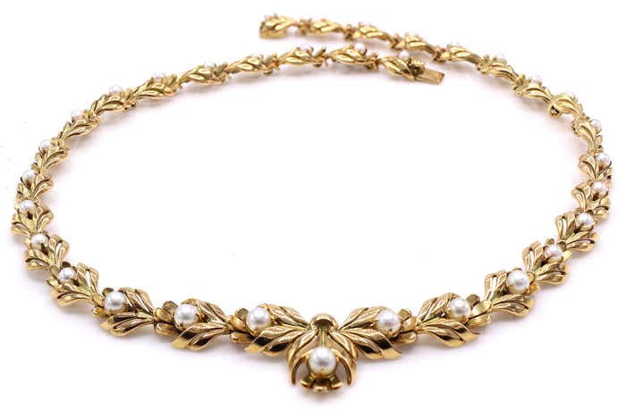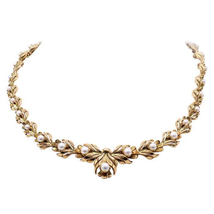 Rive Gauche JewelryBeautifully designed and masterfully handcrafted in 18-karat yellow gold, this French Retro necklace from 1945, with leaf-like elements of polished gold embellished by tiny lustrous white pearls, is a most charming and wearable piece of period jewelry. French hallmarks on the closure. Length: 14.75 in (374.65 mm)