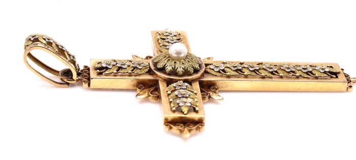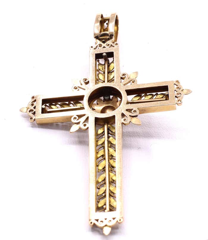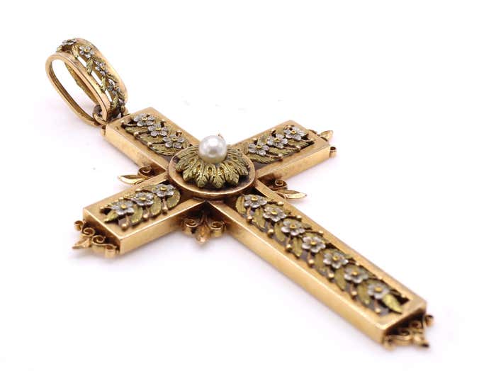 Beautifully designed and masterfully handcrafted, this antique crass was manufactured in France around 1850. Detailed white and yellow work shows blossoms and leaves, embellishing the pendant with a lustrous pearl at the center. French hallmark. Width: 2 in (50.8 mm)Length: 3 in (76.2 mm)