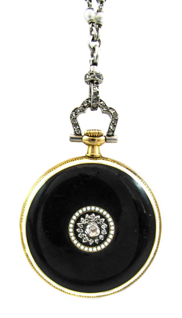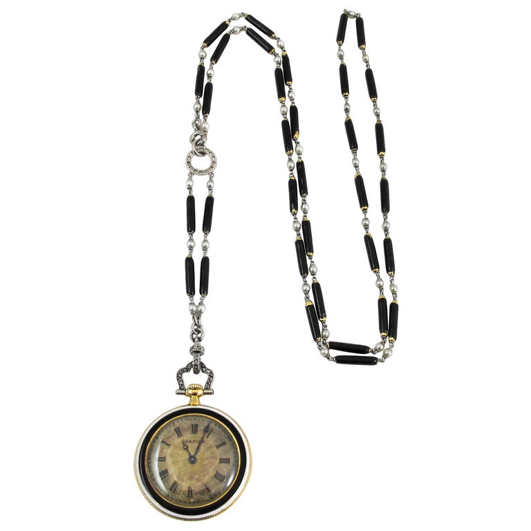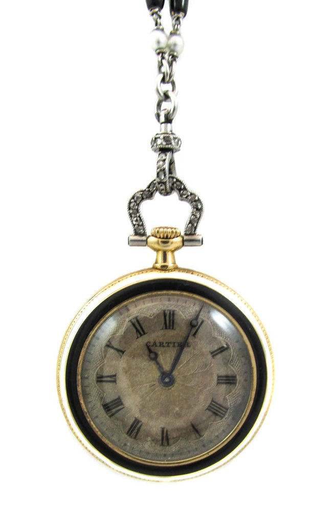 Rive Gauche JewelryThis unique and wonderful Cartier Paris Pendant-Watch necklace was manufactured in ca. 1920 with the dial movement and case signed by Cartier. The original guilloche dial has enamel Roman numerals and fine enamel minute bars on the perimeter. The watch crystal is held within a delicate gold ring surrounded by one ring of shiny enamel and an outside ring of white enamel. The back side of the watch has a delicate ring of white enamel and a larger portion of black enamel with a center that is set with a beautiful rose-cut diamond, surrounded by tiny rose cuts and small dots of white enamel. The chain, consisting of elongated enamel links separated by tiny seed pearls, is attached to two platinum elements set with small rose-cut diamonds.