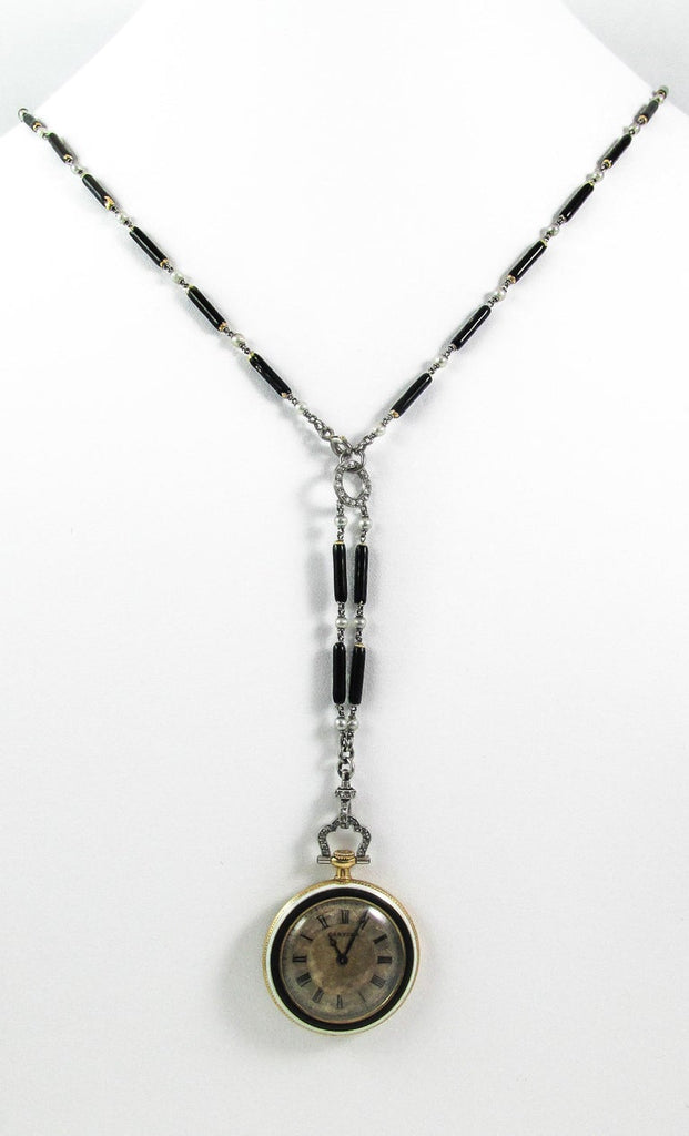 Cartier Platinum Yellow Gold Diamond Black Enamel Pendant Watch Necklace