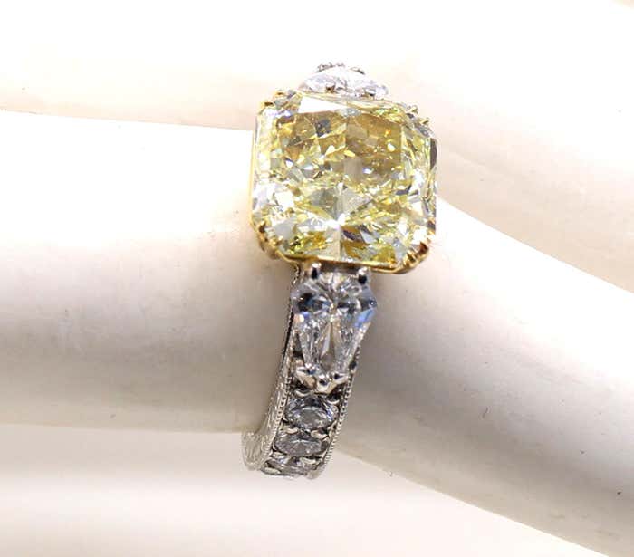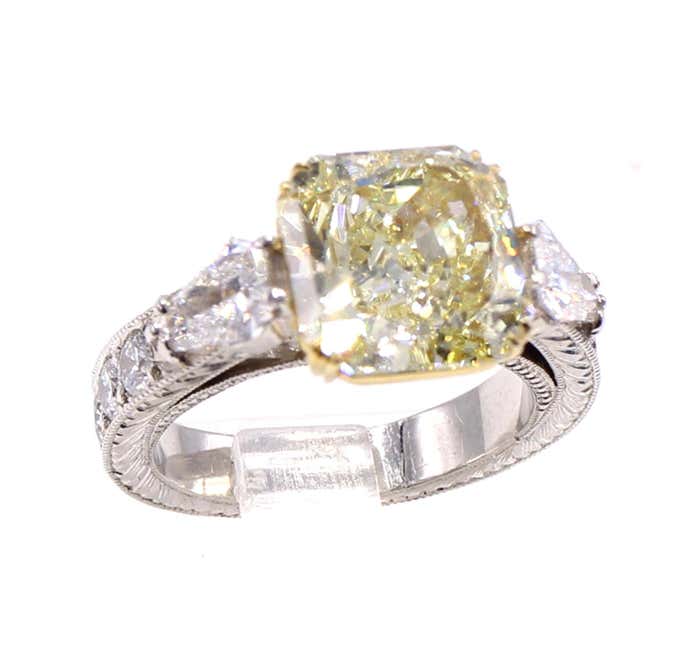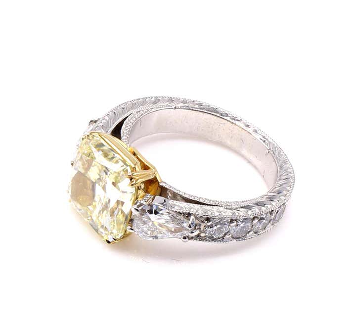 The centerpiece of this beautifully designed and wonderfully handcrafted engagement ring is a lovely lemon-colored Natural Fancy Yellow diamond weighing 4.55 carats. With a depth percentage of 56.5 and a diameter of 9.84 by 9.78 millimeters, this radiant cut diamond spreads larger than most 5 carats with the same cut. Accompanied by a report from the GIA, the clarity is graded as VS1 with an even color distribution and no fluorescence. The center diamond is set in a gallery of 18-karat yellow gold with platinum shanks extending, which are set with an elongated shield shape diamond on either side along with 4 white and lively round brilliant cut diamonds on each shank. The shanks have wonderful hand engravings all around. Ring size 6.25 can be sized.