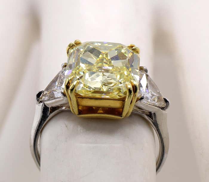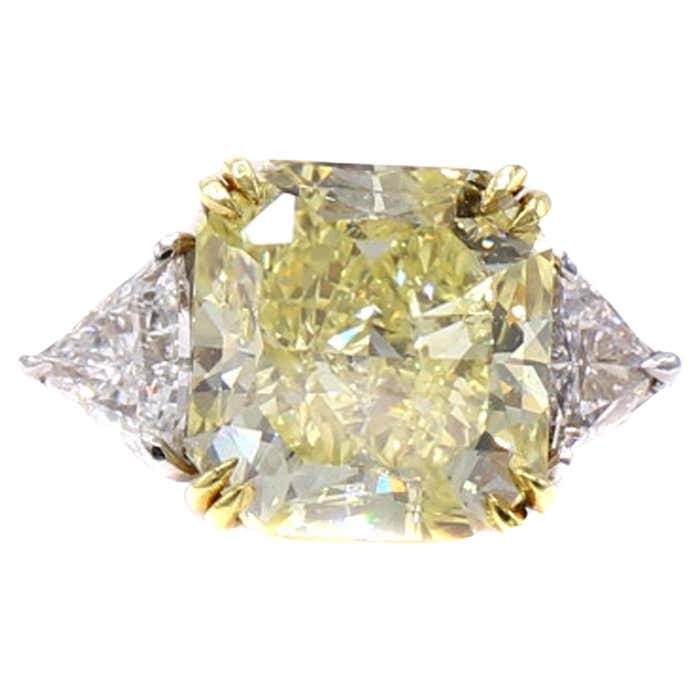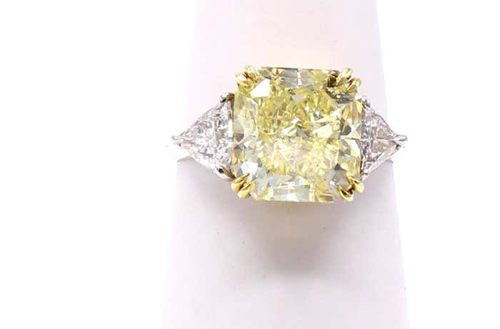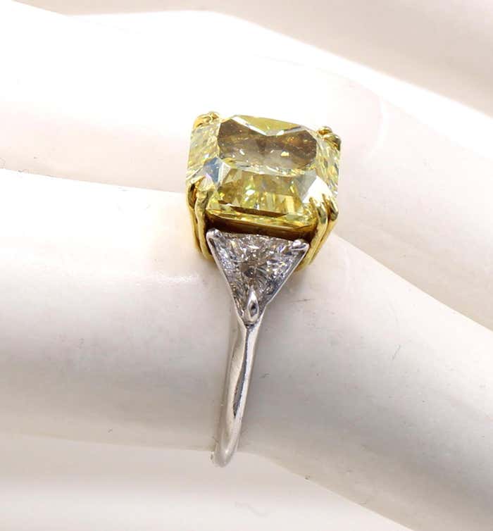 Rive Gauche JewelryA gorgeous, Natural, Fancy, Intense Yellow radiant cut diamond weighing 5.03 carats is the centerpiece of this lovely engagement ring. Accompanied by a report from the GIA giving this diamond a clarity grade of VS2 and an even color distribution, the lovely intense lemon yellow really shows up in this amazing gem. With a perfect depth percentage of 66.5 percent and a table of 66 percent, this diamond truly shows its size. Set in an 18-karat yellow gold gallery, the sides are embellished with 2 bright white and lively trilliant cut diamonds weighing approximately 0.65 carats each. The shank is platinum and is a size 6.25, which can be sized.