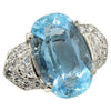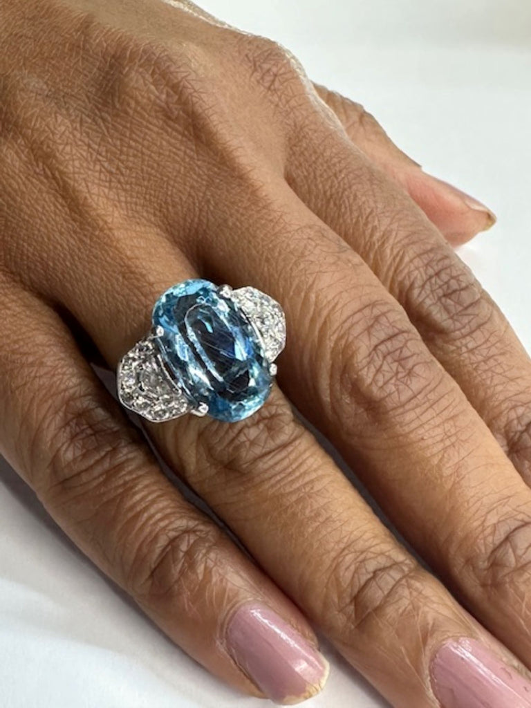 Beautifully designed and masterfully handcrafted, this 1950s platinum ring features a gorgeous oval-cut aquamarine weighing 9.88 carats. Embellishing the center gem are two bright white and sparkly shield-shaped diamonds surrounded by round brilliant-cut diamonds on both sides. Ring size 5, and can be sized. Weight 9,5 grams.