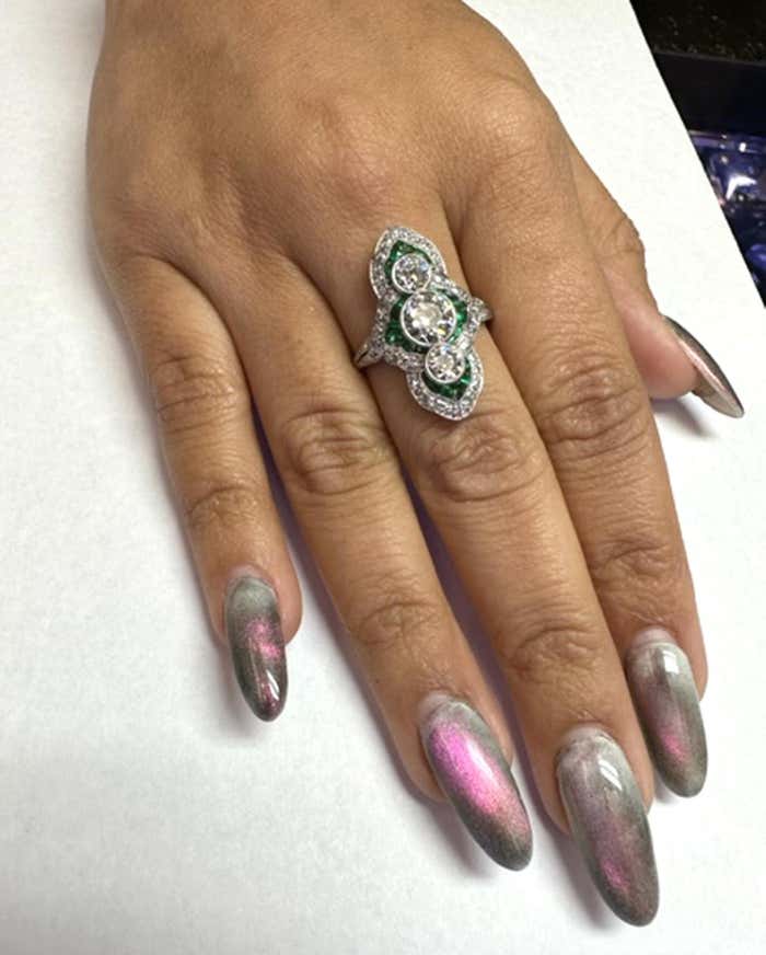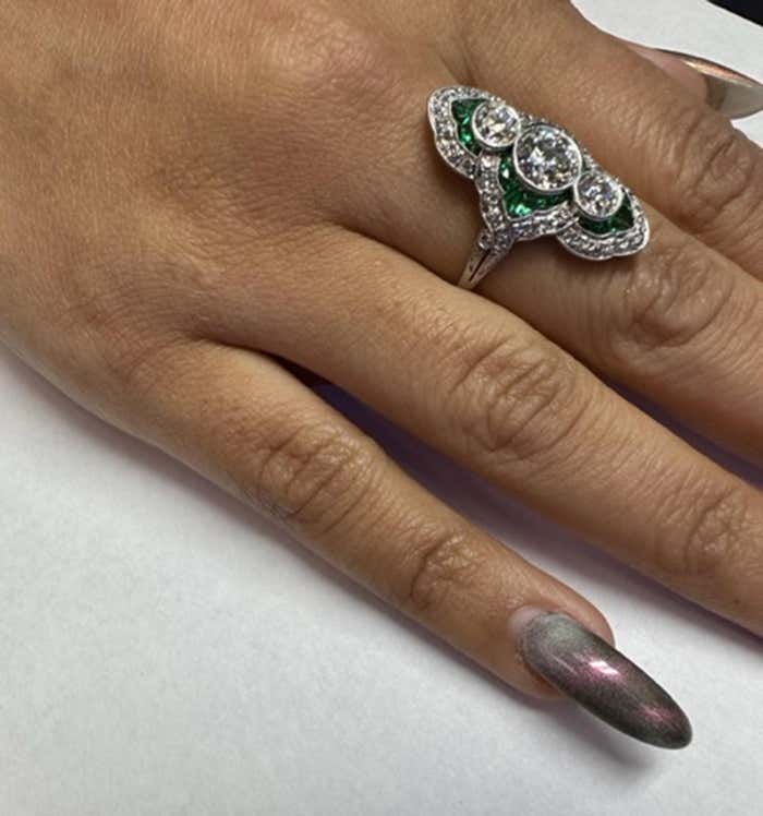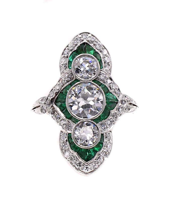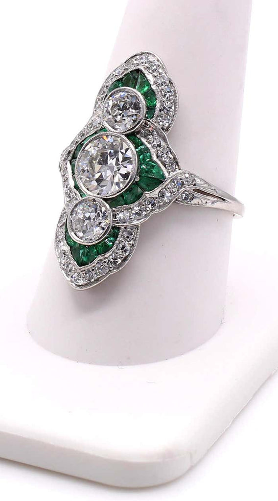 Exquisite Art Deco engagement ring from ca. 1925. Beautifully designed and masterfully handcrafted in platinum, this unique ring is set with 3 center Old European cut diamonds with a total approximate weight of 2 carats. Embellishing the center diamonds are forest green perfectly matched caliber emeralds and an outer row of bright white round old cut diamonds . A wonderful contrast of color and a true piece of art from an exciting time in history. Ring size 9.25 and can be sized.