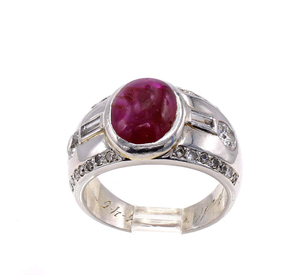 Rive Gauche JewelryThe centerpiece of this well-handcrafted platinum Retro ring from ca 1945 is a pigeon blood red cabochon ruby estimated to weigh approximately 3.60 carats. A baguette cut diamond flanks the bezel set ruby, and one Old European Cut diamond on either side, and the sides of the shanks are embellished by small bright white round cut diamonds. The band has an engraving on the inside dated 1945, which can be removed.