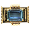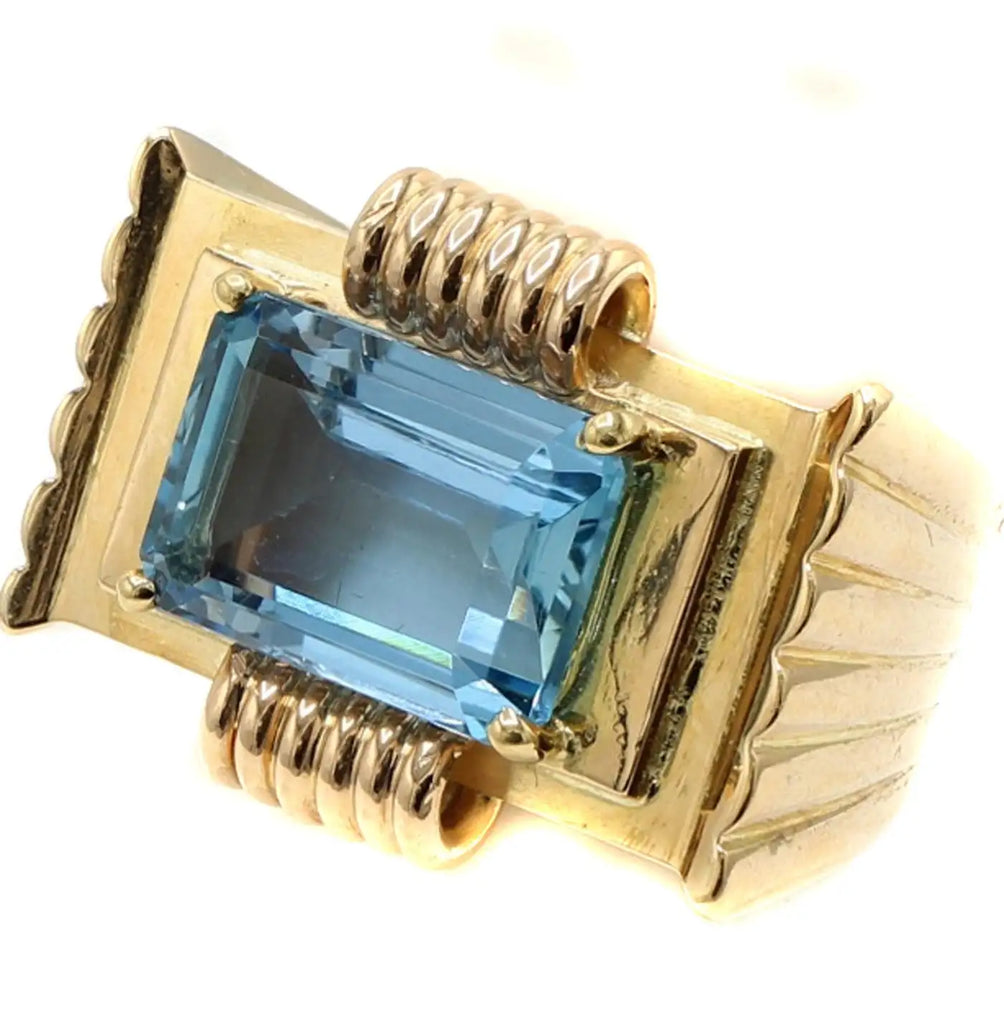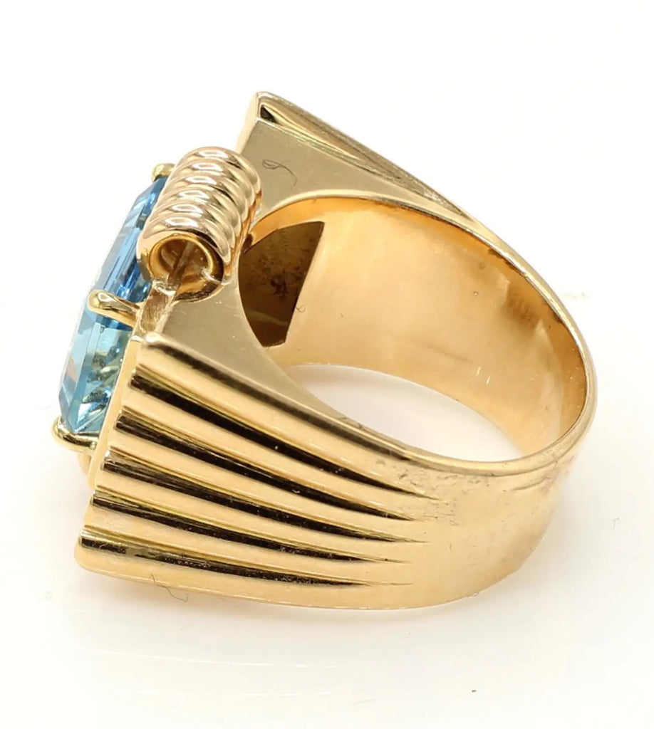 Beautifully designed and masterfully handcrafted French Retro ring from ca 1940. This ring is centrally set with rectangular emerald cut Aquamarine weighing approximately 4.5 carats. The Aquamarine is prong set with tubular elements embellishing the sides which are repeated on either side of the shanks. This bold impressive ring is expressive of the machine age designs of this period and wonderful piece of period jewelry. French assay marks. Size 7.25 and can be sized.