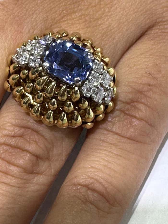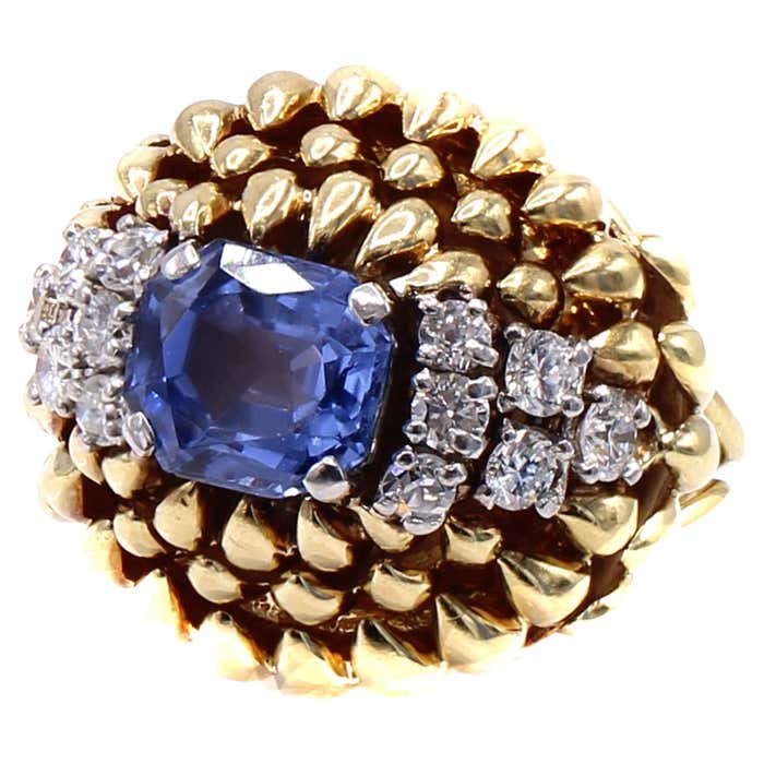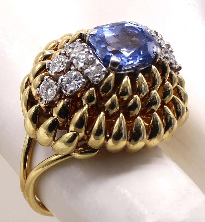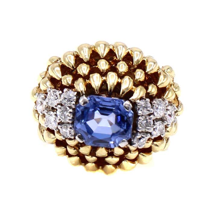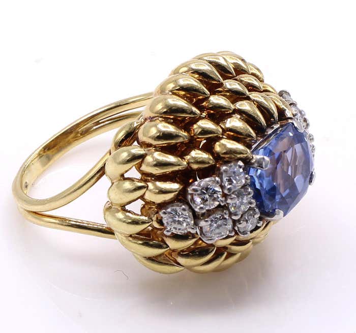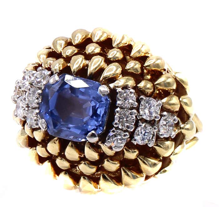 Rive Gauche JewelryBeautifully designed and masterfully handcrafted in ca. 1940, this fantastic retro ring is a piece of art on the finger. Rows of claw-shaped elements, crafted in polished 18-karat yellow gold, dramatically dome upwards, giving this ring an authentic three-dimensional look. The centerpiece is a gorgeous, perfectly cut step-cut sapphire with an exceptional brilliance and saturation of color. Either side of the gemstone is embellished with six bright, white, and sparkly round diamonds. The sapphire weighs 3.23 carats and is accompanied by a report from the GIA, which states that it originates from Sri Lanka and is natural, with no heat treatment or other enhancements. The ring size is 6.5 and can be resized.
