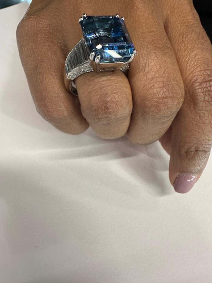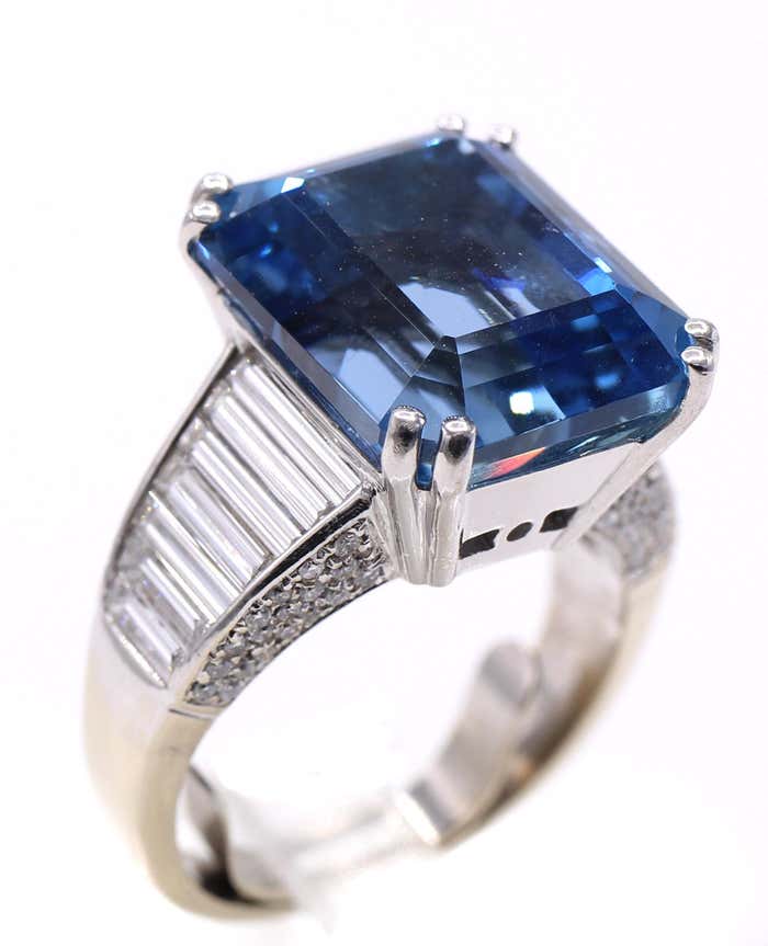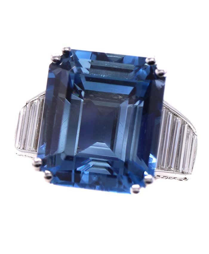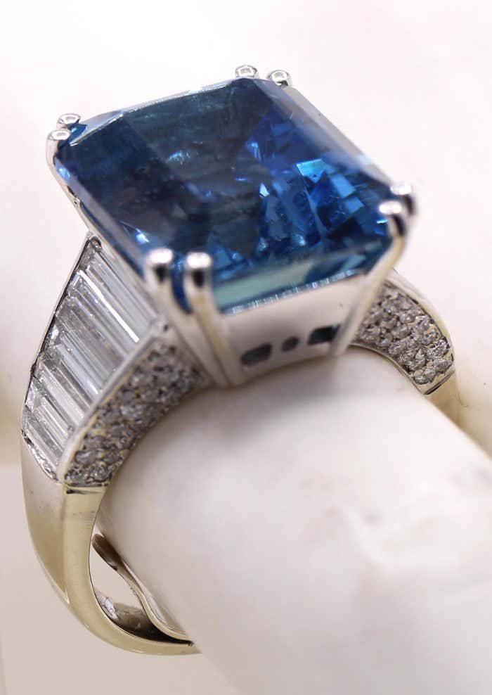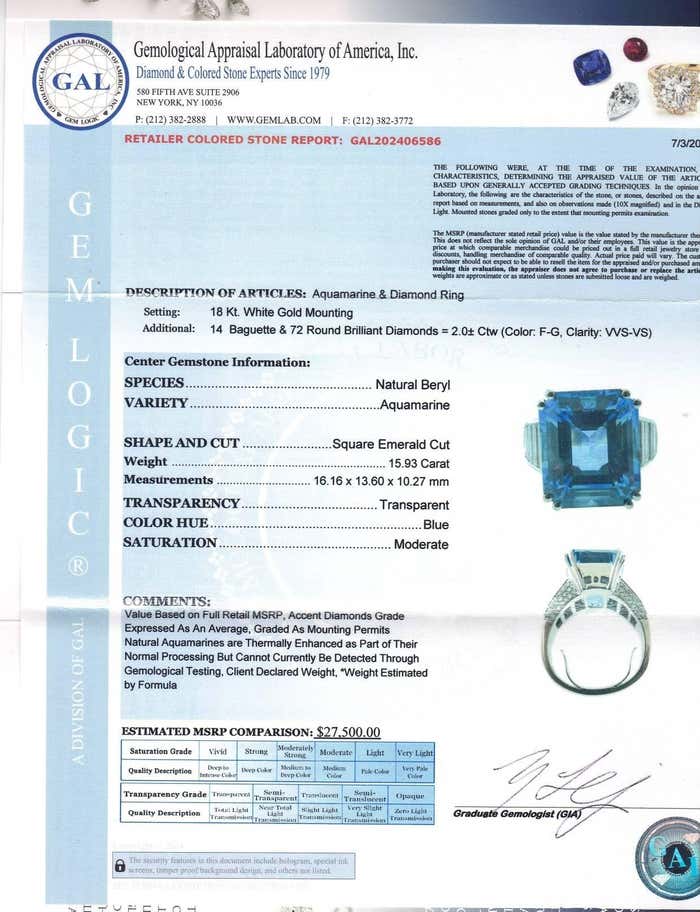 Rive Gauche JewelryThis emerald-cut aquamarine is the centerpiece of this beautiful ring. The deep saturation of color and brilliance warrant giving this gem a 10 out of 10. The deep blue color this aquamarine exhibits was only found in the famous Brazilian Santa Maria mines and is a rarity among these gemstones. The weight of the Aquamarine is 15.93 carats, and it is embellished with 7 perfectly matched bright white long baguette cut diamonds with an approximate total diamond weight of 2 carats. All set in a masterfully handcrafted 18-karat white gold ring mounting. This ring is accompanied by an appraisal from the GAL for a replacement value of $ 27,500. Ring size 6 and can be sized.