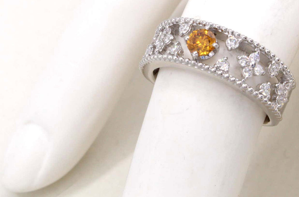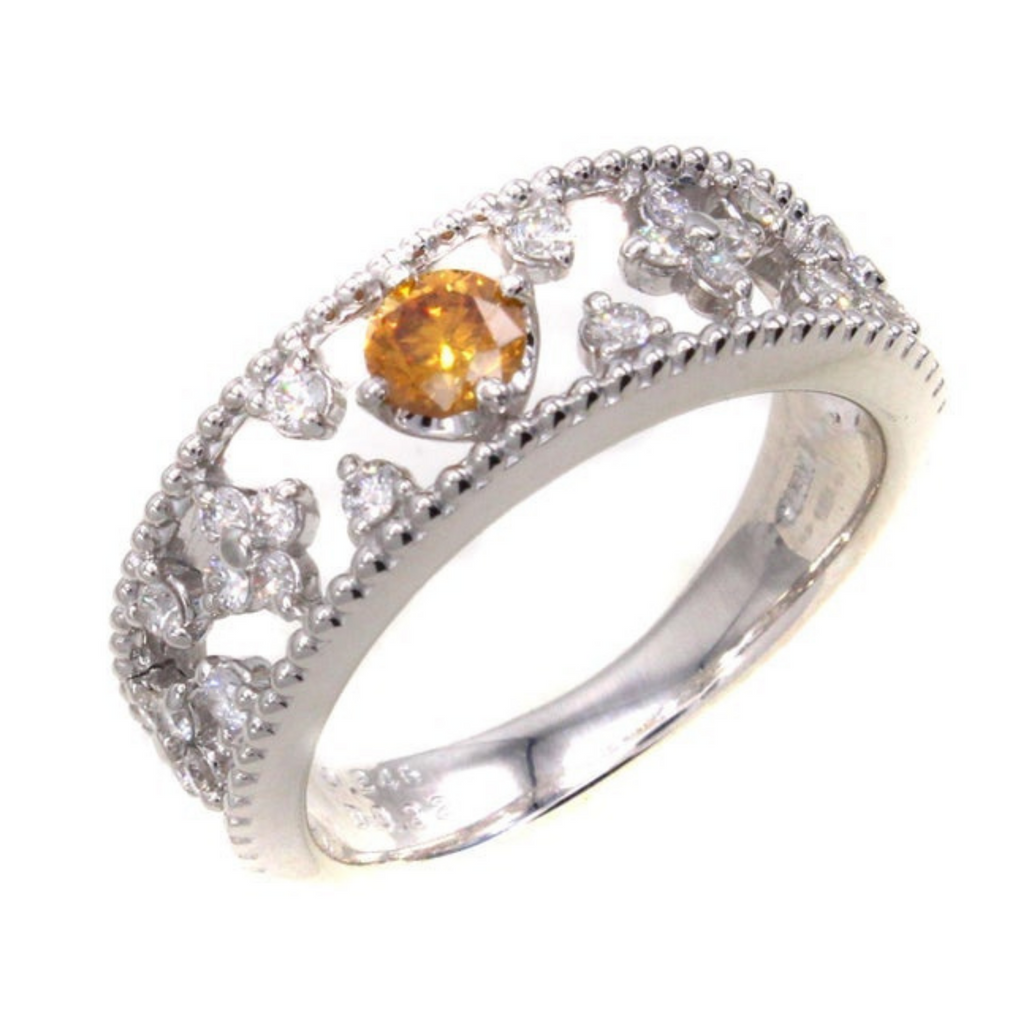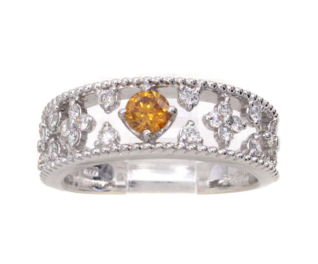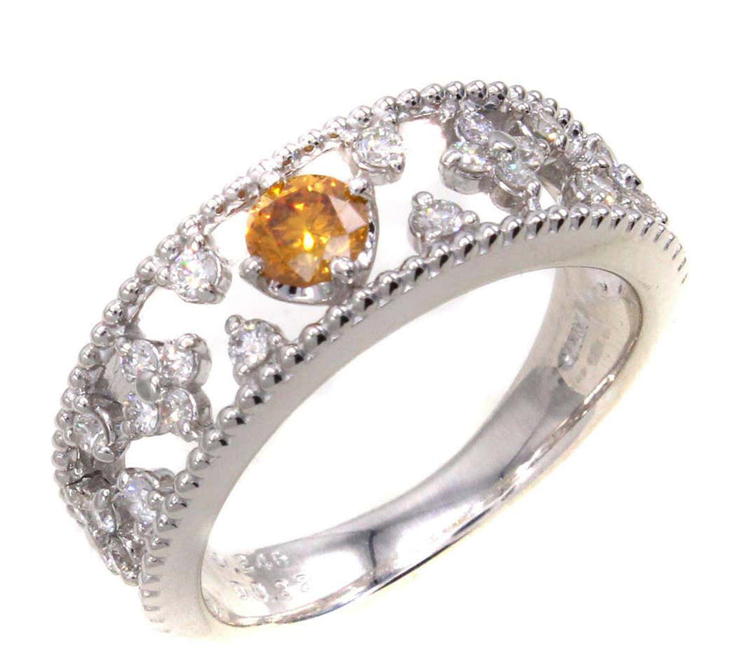 Rive Gauche JewelryA vibrant bright orange brilliant cut diamond weighing 0.24 carats is the centerpiece of this lovely platinum eternity band. Accompanied by a report from the GIA, the color is graded as natural fancy deep yellow-orange. The exceptionally well-handcrafted platinum band is further set with 24 bright white brilliant-cut diamonds weighing 0.32 carats giving this ring a wonderful contrast and display of color. The lower half of the band is worked in highly polished platinum with a graduating shank.